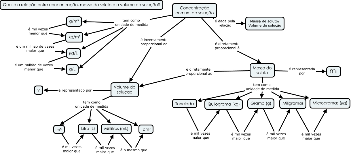 Esse mapa conceitual, produzido no IHMC CmapTools, tem a informação relacionada a: Concentração comum 2C, Massa do soluto tem como unidade de medida Miligramas, Concentração comum da solução é dada pela relação Massa de soluto/ Volume de solução, Concentração comum da solução é inversamente proporcional ao Volume da solução, Concentração comum da solução é diretamente proporcional à Massa do soluto, Massa do soluto é representada por m1, μg/L é um milhão de vezes menor que g/L, Massa do soluto tem como unidade de medida Tonelada, Concentração comum da solução tem como unidade de medida g/m³, Massa do soluto tem como unidade de medida Microgramas (μg), Volume da solução é representado por V, Volume da solução tem como unidade de medida Litro (L), Grama (g) é mil vezes maior que Miligramas, Litro (L) é mil vezes maior que Mililitros (mL), Volume da solução tem como unidade de medida m³, Volume da solução tem como unidade de medida cm³, kg/m³ é um milhão de vezes maior que μg/L, Mililitros (mL) é o mesmo que cm³, m³ é mil vezes maior que Litro (L), Quilograma (kg) é mil vezes maior que Grama (g), Concentração comum da solução tem como unidade de medida g/L