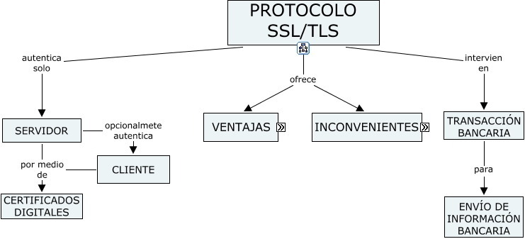 Este Cmap, tiene información relacionada con: SSL, PROTOCOLO SSL/TLS autentica solo SERVIDOR, SERVIDOR opcionalmete autentica CLIENTE, SERVIDOR por medio de CERTIFICADOS DIGITALES, PROTOCOLO SSL/TLS ofrece INCONVENIENTES, PROTOCOLO SSL/TLS intervien en TRANSACCIÓN BANCARIA, TRANSACCIÓN BANCARIA para ENVÍO DE INFORMACIÓN BANCARIA, CLIENTE por medio de CERTIFICADOS DIGITALES, PROTOCOLO SSL/TLS ofrece VENTAJAS
