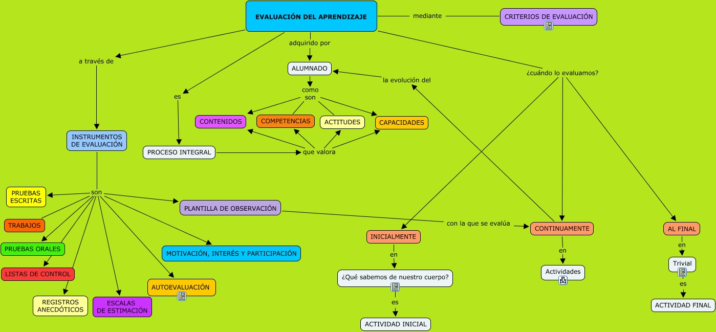 Este Cmap, tiene información relacionada con: EVALUACIÓN DEL APRENDIZAJE, EVALUACIÓN DEL APRENDIZAJE a través de INSTRUMENTOS DE EVALUACIÓN, INSTRUMENTOS DE EVALUACIÓN son PRUEBAS ORALES, INSTRUMENTOS DE EVALUACIÓN son PLANTILLA DE OBSERVACIÓN, EVALUACIÓN DEL APRENDIZAJE adquirido por ALUMNADO, ALUMNADO como son COMPETENCIAS, EVALUACIÓN DEL APRENDIZAJE mediante CRITERIOS DE EVALUACIÓN, INSTRUMENTOS DE EVALUACIÓN son TRABAJOS, ALUMNADO como son CONTENIDOS, INSTRUMENTOS DE EVALUACIÓN son REGISTROS ANECDÓTICOS, EVALUACIÓN DEL APRENDIZAJE ¿cuándo lo evaluamos? CONTINUAMENTE, ¿Qué sabemos de nuestro cuerpo? es ACTIVIDAD INICIAL, INICIALMENTE en ¿Qué sabemos de nuestro cuerpo?, INSTRUMENTOS DE EVALUACIÓN son LISTAS DE CONTROL, INSTRUMENTOS DE EVALUACIÓN son PRUEBAS ESCRITAS, EVALUACIÓN DEL APRENDIZAJE ¿cuándo lo evaluamos? AL FINAL, ALUMNADO como son CAPACIDADES, PROCESO INTEGRAL que valora CAPACIDADES, EVALUACIÓN DEL APRENDIZAJE es PROCESO INTEGRAL, ALUMNADO como son ACTITUDES, PROCESO INTEGRAL que valora ACTITUDES
