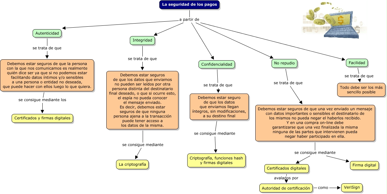 Este Cmap, tiene información relacionada con: seguridad_pagos, Debemos estar seguros de que los datos que enviamos no pueden ser leídos por otra persona distinta del destinatario final deseado, o que si ocurre esto, el espía no pueda conocer el mensaje enviado. Es decir, debemos estar seguros de que ninguna persona ajena a la transacción puede tener acceso a los datos de la misma. se consigue mediante La criptografía, Autoridad de certificación como VeriSign, Autenticidad se trata de que Debemos estar seguros de que la persona con la que nos comunicamos es realmente quién dice ser ya que si no podemos estar facilitando datos íntimos y/o sensibles a una persona o entidad no deseada, que puede hacer con ellos luego lo que quiera., La seguridad de los pagos a partir de Facilidad, Confidencialidad se trata de que Debemos estar seguro de que los datos que enviamos llegan íntegros, sin modificaciones, a su destino final, No repudio se trata de que Debemos estar seguros de que una vez enviado un mensaje con datos importantes o sensibles el destinatario de los mismos no pueda negar el haberlos recibido. Y en una compra on-line debe garantizarse que una vez finalizada la misma ninguna de las partes que intervienen pueda negar haber participado en ella., La seguridad de los pagos a partir de No repudio, Debemos estar seguros de que una vez enviado un mensaje con datos importantes o sensibles el destinatario de los mismos no pueda negar el haberlos recibido. Y en una compra on-line debe garantizarse que una vez finalizada la misma ninguna de las partes que intervienen pueda negar haber participado en ella. se consigue mediante Certificados digitales, Facilidad se trata de que Todo debe ser los más sencillo posible, Debemos estar seguros de que una vez enviado un mensaje con datos importantes o sensibles el destinatario de los mismos no pueda negar el haberlos recibido. Y en una compra on-line debe garantizarse que una vez finalizada la misma ninguna de las partes que intervienen pueda negar haber participado en ella. se consigue mediante Firma digital, Debemos estar seguros de que la persona con la que nos comunicamos es realmente quién dice ser ya que si no podemos estar facilitando datos íntimos y/o sensibles a una persona o entidad no deseada, que puede hacer con ellos luego lo que quiera. se consigue mediante los Certificados y firmas digitales, Debemos estar seguro de que los datos que enviamos llegan íntegros, sin modificaciones, a su destino final se consigue mediante Criptografía, funciones hash y firmas digitales, Integridad se trata de que Debemos estar seguros de que los datos que enviamos no pueden ser leídos por otra persona distinta del destinatario final deseado, o que si ocurre esto, el espía no pueda conocer el mensaje enviado. Es decir, debemos estar seguros de que ninguna persona ajena a la transacción puede tener acceso a los datos de la misma., La seguridad de los pagos a partir de Integridad, La seguridad de los pagos a partir de Autenticidad, Certificados digitales avalados por Autoridad de certificación, La seguridad de los pagos a partir de Confidencialidad