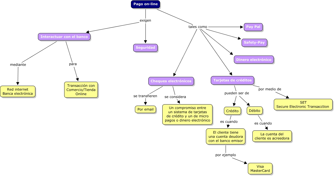 Este Cmap, tiene información relacionada con: pago_on_line, Pago on-line tales como Safety-Pay, Débito es cuando La cuenta del cliente es acreedora, Pago on-line tales como Dinero electrónico, Pago on-line tales como Cheques electrónicos, Tarjetas de créditos pueden ser de Débito, Pago on-line tales como Pay Pal, Interactuar con el banco mediante Red internet Banca electrónica, Pago on-line exigen Seguridad, Interactuar con el banco para Transacción con Comercio/Tienda Online, Cheques electrónicos se considera Un compromiso entre un sistema de tarjetas de crédito y un de micro pagos o dinero electrónico, Cheques electrónicos se transfieren Por email, Tarjetas de créditos por medio de SET Secure Electronic Transacction, Tarjetas de créditos pueden ser de Crédito, Crédito es cuando El cliente tiene una cuenta deudora con el banco emisor, Pago on-line exigen Interactuar con el banco, El cliente tiene una cuenta deudora con el banco emisor por ejemplo Visa MasterCard, Pago on-line tales como Tarjetas de créditos