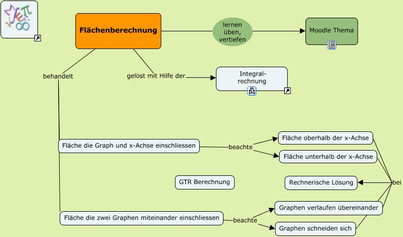 Dieses mit IHMC CmapTools erstellte CMap hat Informationen bezüglich: Flaechenberechnung, Flächenberechnung lernen üben, vertiefen Moodle Thema, Fläche die Graph und x-Achse einschliessen beachte Fläche oberhalb der x-Achse, Fläche die zwei Graphen miteinander einschliessen beachte Graphen verlaufen übereinander, Fläche die zwei Graphen miteinander einschliessen beachte Graphen schneiden sich, Flächenberechnung gelöst mit Hilfe der Integral- rechnung, Flächenberechnung behandelt Fläche die zwei Graphen miteinander einschliessen, Flächenberechnung behandelt Fläche die Graph und x-Achse einschliessen, Fläche oberhalb der x-Achse bei Rechnerische Lösung, Fläche unterhalb der x-Achse bei Rechnerische Lösung, Graphen schneiden sich bei Rechnerische Lösung, Fläche die Graph und x-Achse einschliessen beachte Fläche unterhalb der x-Achse, Graphen verlaufen übereinander bei Rechnerische Lösung