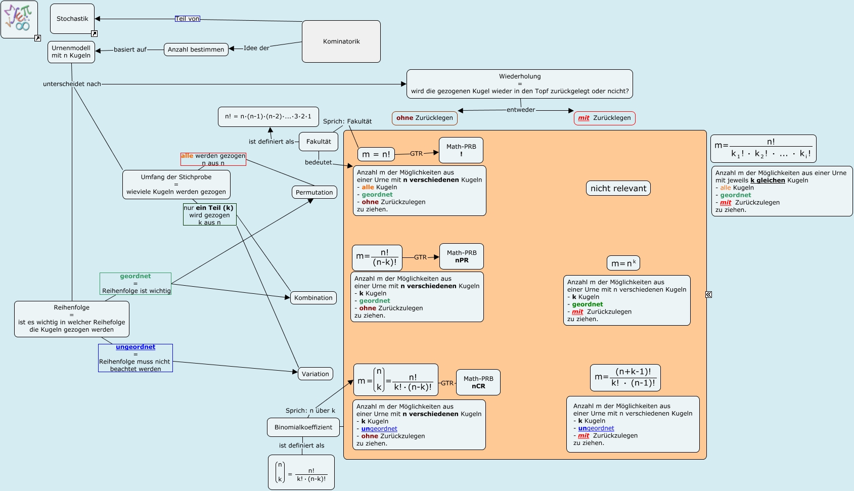 Dieses mit IHMC CmapTools erstellte CMap hat Informationen bezüglich: Kombinatorik, <math xmlns="http://www.w3.org/1998/Math/MathML"> <mrow> <mtext> m = n! </mtext> </mrow> </math> GTR Math-PRB !, Urnenmodell mit n Kugeln unterscheidet nach Reihenfolge = ist es wichtig in welcher Reihefolge die Kugeln gezogen werden, Binomialkoeffizient ist definiert als <math xmlns="http://www.w3.org/1998/Math/MathML"> <mrow> <mfenced open="(" close=")"> <mtable> <mtr> <mtd> <mtext> n </mtext> </mtd> </mtr> <mtr> <mtd> <mtext> k </mtext> </mtd> </mtr> </mtable> </mfenced> <mtext> = </mtext> <mfrac> <mtext> n! </mtext> <mrow> <mtext> k! </mtext> <mtext> ⋅ </mtext> <mtext> (n-k)! </mtext> </mrow> </mfrac> </mrow> </math>, Urnenmodell mit n Kugeln unterscheidet nach Umfang der Stichprobe = wieviele Kugeln werden gezogen, Umfang der Stichprobe = wieviele Kugeln werden gezogen nur ein Teil (k) wird gezogen k aus n Kombination, Reihenfolge = ist es wichtig in welcher Reihefolge die Kugeln gezogen werden geordnet = Reihenfolge ist wichtig Kombination, Fakultät Sprich: Fakultät <math xmlns="http://www.w3.org/1998/Math/MathML"> <mrow> <mtext> m = n! </mtext> </mrow> </math>, Binomialkoeffizient bedeutet Anzahl m der Möglichkeiten aus einer Urne mit n verschiedenen Kugeln - k Kugeln - ungeordnet - ohne Zurückzulegen zu ziehen., Kominatorik Idee der Anzahl bestimmen, Fakultät bedeutet Anzahl m der Möglichkeiten aus einer Urne mit n verschiedenen Kugeln - alle Kugeln - geordnet - ohne Zurückzulegen zu ziehen., <math xmlns="http://www.w3.org/1998/Math/MathML"> <mrow> <mtext> m </mtext> <mrow> <mtext> = </mtext> <mfenced open="(" close=")"> <mtable> <mtr> <mtd> <mtext> n </mtext> </mtd> </mtr> <mtr> <mtd> <mtext> k </mtext> </mtd> </mtr> </mtable> </mfenced> </mrow> <mtext> = </mtext> <mfrac> <mtext> n! </mtext> <mrow> <mtext> k! </mtext> <mtext> ⋅ </mtext> <mtext> (n-k)! </mtext> </mrow> </mfrac> <mrow> <mtext> </mtext> </mrow> </mrow> </math> GTR Math-PRB nCR, Anzahl bestimmen basiert auf Urnenmodell mit n Kugeln, Umfang der Stichprobe = wieviele Kugeln werden gezogen alle werden gezogen n aus n Permutation, Kominatorik Teil von Stochastik, Binomialkoeffizient Sprich: n über k <math xmlns="http://www.w3.org/1998/Math/MathML"> <mrow> <mtext> m </mtext> <mrow> <mtext> = </mtext> <mfenced open="(" close=")"> <mtable> <mtr> <mtd> <mtext> n </mtext> </mtd> </mtr> <mtr> <mtd> <mtext> k </mtext> </mtd> </mtr> </mtable> </mfenced> </mrow> <mtext> = </mtext> <mfrac> <mtext> n! </mtext> <mrow> <mtext> k! </mtext> <mtext> ⋅ </mtext> <mtext> (n-k)! </mtext> </mrow> </mfrac> <mrow> <mtext> </mtext> </mrow> </mrow> </math>, <math xmlns="http://www.w3.org/1998/Math/MathML"> <mrow> <mtext> m= </mtext> <mfrac> <mtext> n! </mtext> <mtext> (n-k)! </mtext> </mfrac> </mrow> </math> GTR Math-PRB nPR, Reihenfolge = ist es wichtig in welcher Reihefolge die Kugeln gezogen werden ungeordnet = Reihenfolge muss nicht beachtet werden Variation, Urnenmodell mit n Kugeln unterscheidet nach Wiederholung = wird die gezogenen Kugel wieder in den Topf zurückgelegt oder ncicht?, Fakultät ist definiert als n! = n⋅(n-1)⋅(n-2)⋅...⋅3⋅2⋅1, Wiederholung = wird die gezogenen Kugel wieder in den Topf zurückgelegt oder ncicht? entweder mit Zurücklegen
