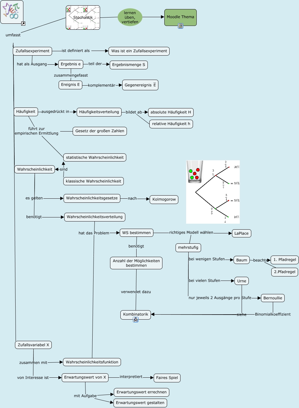 Dieses mit IHMC CmapTools erstellte CMap hat Informationen bezüglich: Stochastik, Zufallsexperiment ist definiert als Was ist ein Zufallsexperiment, Erwartungswert von X interpretiert Faires Spiel, Stochastik umfasst Wahrscheinlichkeit, Wahrscheinlichkeitsverteilung hat das Problem WS bestimmen, mehrstufig bei vielen Stufen Urne, Wahrscheinlichkeit benötigt Wahrscheinlichkeitsverteilung, Ereignis E komplementär <math xmlns="http://www.w3.org/1998/Math/MathML"> <mrow> <mtext> Gegenereignis </mtext> <munderover> <mtext> E </mtext> <none/> <mtext> _ </mtext> </munderover> </mrow> </math>, Gesetz der großen Zahlen führt zur empirischen Ermittlung statistische Wahrscheinlichkeit, Erwartungswert von X mit Aufgabe Erwartungswert errechnen, klassische Wahrscheinlichkeit sind Wahrscheinlichkeit, WS bestimmen richtiges Modell wählen LaPlace, Stochastik umfasst Zufallsvariabel X, Bernoullie Binomialkoeffizient Kombinatorik, Urne siehe Kombinatorik, Zufallsvariabel X zusammen mit Wahrscheinlichkeitsfunktion, WS bestimmen benötigt Anzahl der Möglichkeiten bestimmen, Baum beachte 2.Pfadregel, Stochastik umfasst Häufigkeit, mehrstufig bei wenigen Stufen Baum, Wahrscheinlichkeitsfunktion hat das Problem WS bestimmen