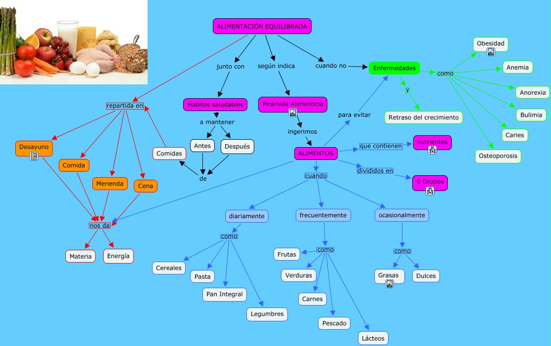 Este Cmap, tiene información relacionada con: Alimentación equilibrada, Cena nos da Materia, ALIMENTOS cuando diariamente, ALIMENTACIÓN EQUILIBRADA repartida en Cena, Enfermedades como Caries, frecuentemente como Frutas, ALIMENTACIÓN EQUILIBRADA repartida en Merienda, diariamente como Pan Integral, diariamente como Cereales, ocasionalmente como Grasas, Merienda nos da Energía, ALIMENTACIÓN EQUILIBRADA repartida en Comida, Habitos saludables a mantener Después, Enfermedades como Bulimia, ALIMENTOS cuando frecuentemente, ALIMENTOS nos da Materia, Después de Comidas, diariamente como Legumbres, ALIMENTOS cuando ocasionalmente, frecuentemente como Lácteos, Enfermedades como Osteoporosis