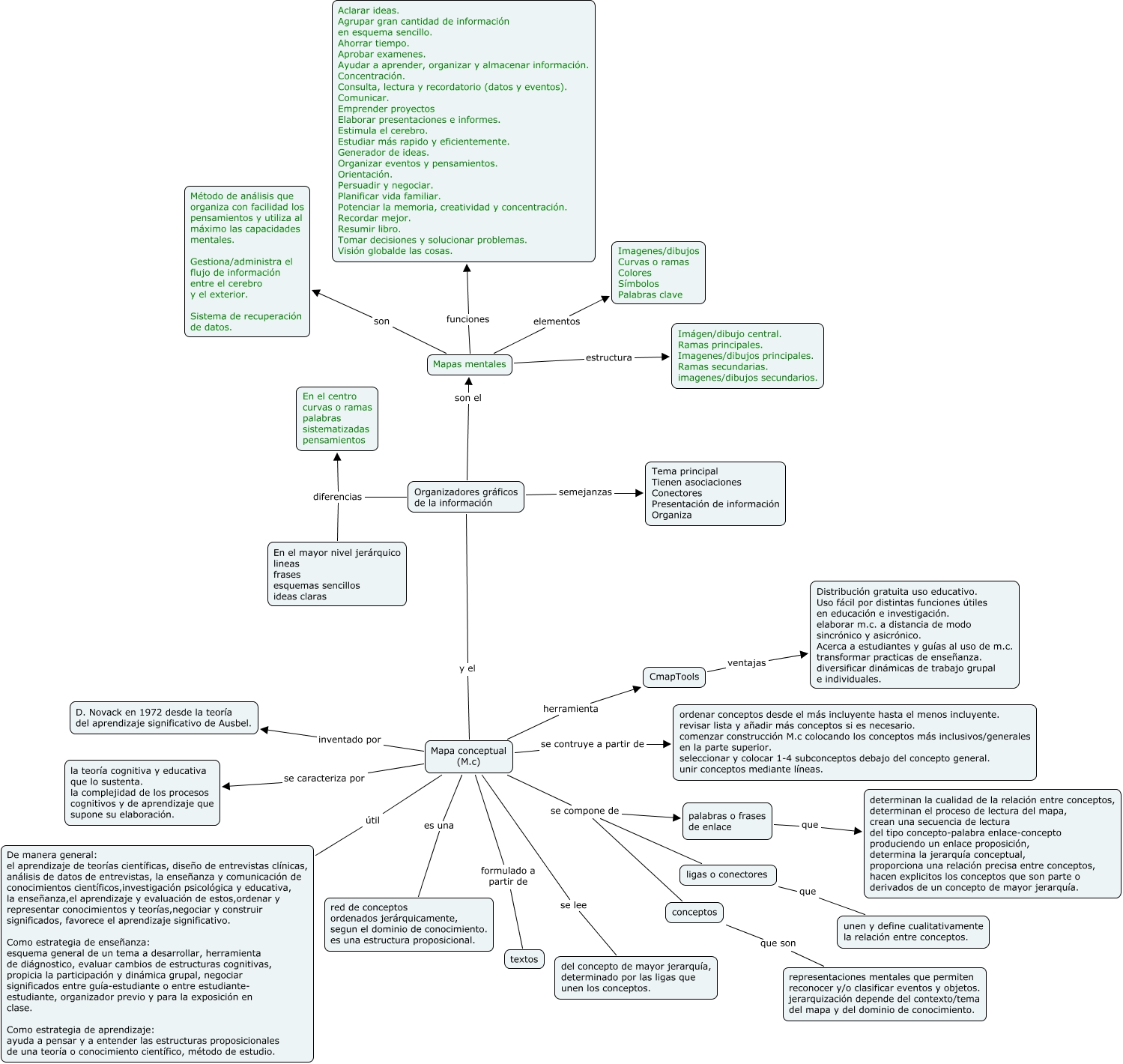 Este Cmap, tiene información relacionada con: Diferencias entre mapa conceptual y mapa mental Rita Rojas H, Mapa conceptual (M.c) se caracteriza por la teoría cognitiva y educativa que lo sustenta. la complejidad de los procesos cognitivos y de aprendizaje que supone su elaboración., Mapa conceptual (M.c) se lee del concepto de mayor jerarquía, determinado por las ligas que unen los conceptos., palabras o frases de enlace que determinan la cualidad de la relación entre conceptos, determinan el proceso de lectura del mapa, crean una secuencia de lectura del tipo concepto-palabra enlace-concepto produciendo un enlace proposición, determina la jerarquía conceptual, proporciona una relación precisa entre conceptos, hacen explicitos los conceptos que son parte o derivados de un concepto de mayor jerarquía., Mapa conceptual (M.c) herramienta CmapTools, conceptos que son representaciones mentales que permiten reconocer y/o clasificar eventos y objetos. jerarquización depende del contexto/tema del mapa y del dominio de conocimiento., Mapa conceptual (M.c) se compone de ligas o conectores, Mapa conceptual (M.c) útil De manera general: el aprendizaje de teorías científicas, diseño de entrevistas clínicas, análisis de datos de entrevistas, la enseñanza y comunicación de conocimientos científicos,investigación psicológica y educativa, la enseñanza,el aprendizaje y evaluación de estos,ordenar y representar conocimientos y teorías,negociar y construir significados, favorece el aprendizaje significativo. Como estrategia de enseñanza: esquema general de un tema a desarrollar, herramienta de diágnostico, evaluar cambios de estructuras cognitivas, propicia la participación y dinámica grupal, negociar significados entre guía-estudiante o entre estudiante- estudiante, organizador previo y para la exposición en clase. Como estrategia de aprendizaje: ayuda a pensar y a entender las estructuras proposicionales de una teoría o conocimiento científico, método de estudio., Mapa conceptual (M.c) se contruye a partir de ordenar conceptos desde el más incluyente hasta el menos incluyente. revisar lista y añadir más conceptos si es necesario. comenzar construcción M.c colocando los conceptos más inclusivos/generales en la parte superior. seleccionar y colocar 1-4 subconceptos debajo del concepto general. unir conceptos mediante líneas., Mapa conceptual (M.c) es una red de conceptos ordenados jerárquicamente, segun el dominio de conocimiento. es una estructura proposicional., Organizadores gráficos de la información y el Mapa conceptual (M.c), Organizadores gráficos de la información son el Mapas mentales, Mapa conceptual (M.c) inventado por D. Novack en 1972 desde la teoría del aprendizaje significativo de Ausbel., Mapas mentales estructura Imágen/dibujo central. Ramas principales. Imagenes/dibujos principales. Ramas secundarias. imagenes/dibujos secundarios., Organizadores gráficos de la información diferencias En el centro curvas o ramas palabras sistematizadas pensamientos, Mapas mentales funciones Aclarar ideas. Agrupar gran cantidad de información en esquema sencillo. Ahorrar tiempo. Aprobar examenes. Ayudar a aprender, organizar y almacenar información. Concentración. Consulta, lectura y recordatorio (datos y eventos). Comunicar. Emprender proyectos Elaborar presentaciones e informes. Estimula el cerebro. Estudiar más rapido y eficientemente. Generador de ideas. Organizar eventos y pensamientos. Orientación. Persuadir y negociar. Planificar vida familiar. Potenciar la memoria, creatividad y concentración. Recordar mejor. Resumir libro. Tomar decisiones y solucionar problemas. Visión globalde las cosas., Mapas mentales son Método de análisis que organiza con facilidad los pensamientos y utiliza al máximo las capacidades mentales. Gestiona/administra el flujo de información entre el cerebro y el exterior. Sistema de recuperación de datos., ligas o conectores que unen y define cualitativamente la relación entre conceptos., Mapas mentales elementos Imagenes/dibujos Curvas o ramas Colores Símbolos Palabras clave, Mapa conceptual (M.c) formulado a partir de textos, CmapTools ventajas Distribución gratuita uso educativo. Uso fácil por distintas funciones útiles en educación e investigación. elaborar m.c. a distancia de modo sincrónico y asicrónico. Acerca a estudiantes y guías al uso de m.c. transformar practicas de enseñanza. diversificar dinámicas de trabajo grupal e individuales.