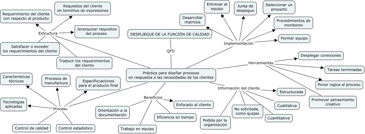 Este Cmap, tiene información relacionada con: QFD, Práctica para diseñar procesos en respuesta a las necesidades de los clientes Implementación Junta de despegue, Práctica para diseñar procesos en respuesta a las necesidades de los clientes Herramientas Promover pensamiento creativo, Práctica para diseñar procesos en respuesta a las necesidades de los clientes Información del cliente Pedida por la organización, Práctica para diseñar procesos en respuesta a las necesidades de los clientes Información del cliente Estructurada, Práctica para diseñar procesos en respuesta a las necesidades de los clientes Estructura Traducir los requerimientos del cliente, Práctica para diseñar procesos en respuesta a las necesidades de los clientes Estructura Requerimiento del cliente con respecto al producto, Práctica para diseñar procesos en respuesta a las necesidades de los clientes Estructura Satisfacer o exceder los requerimientos del cliente, Práctica para diseñar procesos en respuesta a las necesidades de los clientes Herramientas Tareas terminadas, Práctica para diseñar procesos en respuesta a las necesidades de los clientes Herramientas Poner logica al proceso, Práctica para diseñar procesos en respuesta a las necesidades de los clientes Implementación Entrenar al equipo, Práctica para diseñar procesos en respuesta a las necesidades de los clientes Proceso Caracteristicas técnicas, Práctica para diseñar procesos en respuesta a las necesidades de los clientes Beneficios Trabajo en equipo, Práctica para diseñar procesos en respuesta a las necesidades de los clientes Estructura Jerarquizar requisitos del proceso, Práctica para diseñar procesos en respuesta a las necesidades de los clientes Beneficios Eficiencia en tiempo, Práctica para diseñar procesos en respuesta a las necesidades de los clientes Información del cliente Cuantitativa, Práctica para diseñar procesos en respuesta a las necesidades de los clientes Implementación Seleccionar un proyecto, DESPLIEGUE DE LA FUNCIÓN DE CALIDAD QFD Práctica para diseñar procesos en respuesta a las necesidades de los clientes, Práctica para diseñar procesos en respuesta a las necesidades de los clientes Implementación Formar equipo, Práctica para diseñar procesos en respuesta a las necesidades de los clientes Implementación Procedimientos de monitoreo, Práctica para diseñar procesos en respuesta a las necesidades de los clientes Proceso Control de calidad