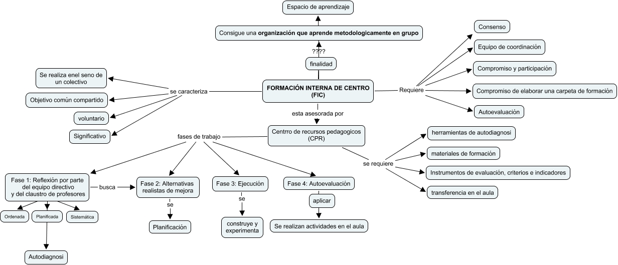 Aquest mapa conceptual conté informació relacionada amb: FIC, Centrro de recursos pedagogicos (CPR) fases de trabajo Fase 2: Alternativas realistas de mejora, FORMACIÓN INTERNA DE CENTRO (FIC) se caracteriza Se realiza enel seno de un colectivo, Centrro de recursos pedagogicos (CPR) se requiere Instrumentos de evaluación, criterios e indicadores, Centrro de recursos pedagogicos (CPR) se requiere transferencia en el aula, FORMACIÓN INTERNA DE CENTRO (FIC) esta asesorada por Centrro de recursos pedagogicos (CPR), Fase 1: Reflexión por parte del equipo directivo y del claustro de profesores ???? Autodiagnosi, FORMACIÓN INTERNA DE CENTRO (FIC) Requiere Equipo de coordinación, FORMACIÓN INTERNA DE CENTRO (FIC) se caracteriza Objetivo común compartido, FORMACIÓN INTERNA DE CENTRO (FIC) se caracteriza Significativo, Centrro de recursos pedagogicos (CPR) fases de trabajo Fase 1: Reflexión por parte del equipo directivo y del claustro de profesores, FORMACIÓN INTERNA DE CENTRO (FIC) se caracteriza voluntario, Centrro de recursos pedagogicos (CPR) fases de trabajo Fase 4: Autoevaluación, Centrro de recursos pedagogicos (CPR) fases de trabajo Fase 3: Ejecución, FORMACIÓN INTERNA DE CENTRO (FIC) ???? Espacio de aprendizaje, FORMACIÓN INTERNA DE CENTRO (FIC) Requiere Consenso, FORMACIÓN INTERNA DE CENTRO (FIC) Requiere Compromiso y participación, FORMACIÓN INTERNA DE CENTRO (FIC) Requiere Compromiso de elaborar una carpeta de formación, Centrro de recursos pedagogicos (CPR) se requiere materiales de formación, Fase 4: Autoevaluación ???? Se realizan actividades en el aula, FORMACIÓN INTERNA DE CENTRO (FIC) ???? Consigue una organización que aprende metodologicamente en grupo