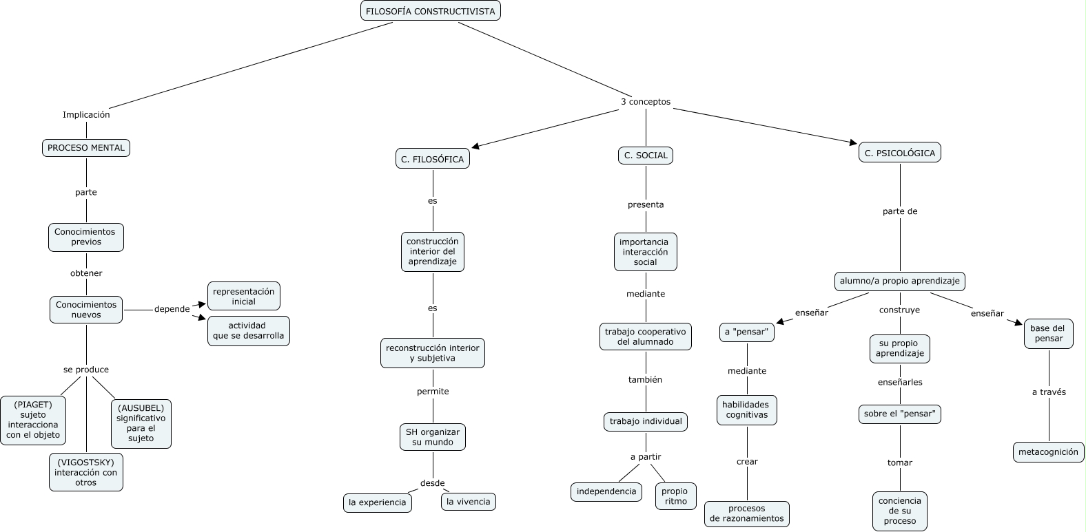 Este Cmap, tiene información relacionada con: MAPA FILOSOFÍA CONSTRUCTIVISTA, Conocimientos nuevos se produce (AUSUBEL) significativo para el sujeto, C. SOCIAL presenta importancia interacción social, alumno/a propio aprendizaje construye su propio aprendizaje, alumno/a propio aprendizaje enseñar a "pensar", Conocimientos nuevos depende representación inicial, sobre el "pensar" tomar conciencia de su proceso, construcción interior del aprendizaje es reconstrucción interior y subjetiva, Conocimientos previos obtener Conocimientos nuevos, importancia interacción social mediante trabajo cooperativo del alumnado, habilidades cognitivas crear procesos de razonamientos, C. PSICOLÓGICA parte de alumno/a propio aprendizaje, trabajo cooperativo del alumnado también trabajo individual, Conocimientos nuevos depende actividad que se desarrolla, C. FILOSÓFICA es construcción interior del aprendizaje, SH organizar su mundo desde la experiencia, a "pensar" mediante habilidades cognitivas, PROCESO MENTAL parte Conocimientos previos, FILOSOFÍA CONSTRUCTIVISTA 3 conceptos C. PSICOLÓGICA, reconstrucción interior y subjetiva permite SH organizar su mundo, trabajo individual a partir independencia