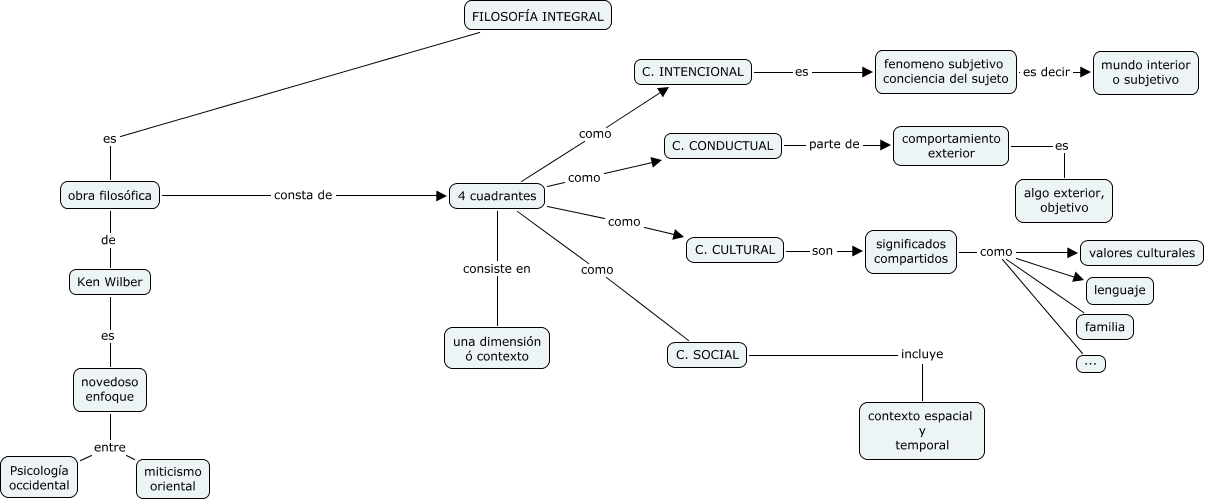 Este Cmap, tiene información relacionada con: filosofía integral, 4 cuadrantes como C. INTENCIONAL, C. INTENCIONAL es fenomeno subjetivo conciencia del sujeto, C. CULTURAL son significados compartidos, obra filosófica consta de 4 cuadrantes, significados compartidos como familia, comportamiento exterior es algo exterior, objetivo, significados compartidos como lenguaje, novedoso enfoque entre Psicología occidental, significados compartidos como ..., significados compartidos como valores culturales, fenomeno subjetivo conciencia del sujeto es decir mundo interior o subjetivo, Ken Wilber es novedoso enfoque, 4 cuadrantes como C. SOCIAL, C. SOCIAL incluye contexto espacial y temporal, obra filosófica de Ken Wilber, 4 cuadrantes como C. CULTURAL, 4 cuadrantes consiste en una dimensión ó contexto, 4 cuadrantes como C. CONDUCTUAL, C. CONDUCTUAL parte de comportamiento exterior, FILOSOFÍA INTEGRAL es obra filosófica