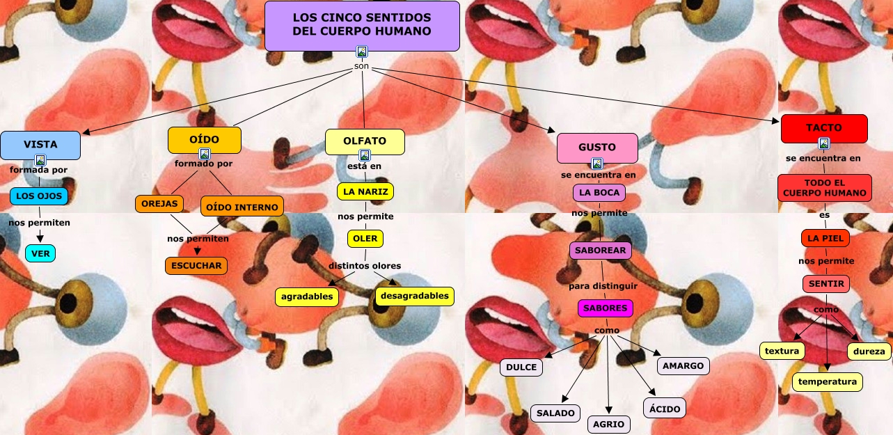 Este Cmap, tiene información relacionada con: LOS CINCO SENTIDOS, LOS CINCO SENTIDOS DEL CUERPO HUMANO son OLFATO, LOS CINCO SENTIDOS DEL CUERPO HUMANO son TACTO, OLER distintos olores desagradables, SENTIR como dureza, GUSTO se encuentra en LA BOCA, VISTA formada por LOS OJOS, SABOREAR para distinguir SABORES, OÍDO formado por OÍDO INTERNO, OLFATO está en LA NARIZ, SABORES como ÁCIDO, TACTO se encuentra en TODO EL CUERPO HUMANO, LA PIEL nos permite SENTIR, OÍDO formado por OREJAS, OREJAS nos permiten ESCUCHAR, LOS CINCO SENTIDOS DEL CUERPO HUMANO son VISTA, LOS CINCO SENTIDOS DEL CUERPO HUMANO son GUSTO, SABORES como AMARGO, OÍDO INTERNO nos permiten ESCUCHAR, SABORES como AGRIO, LOS OJOS nos permiten VER