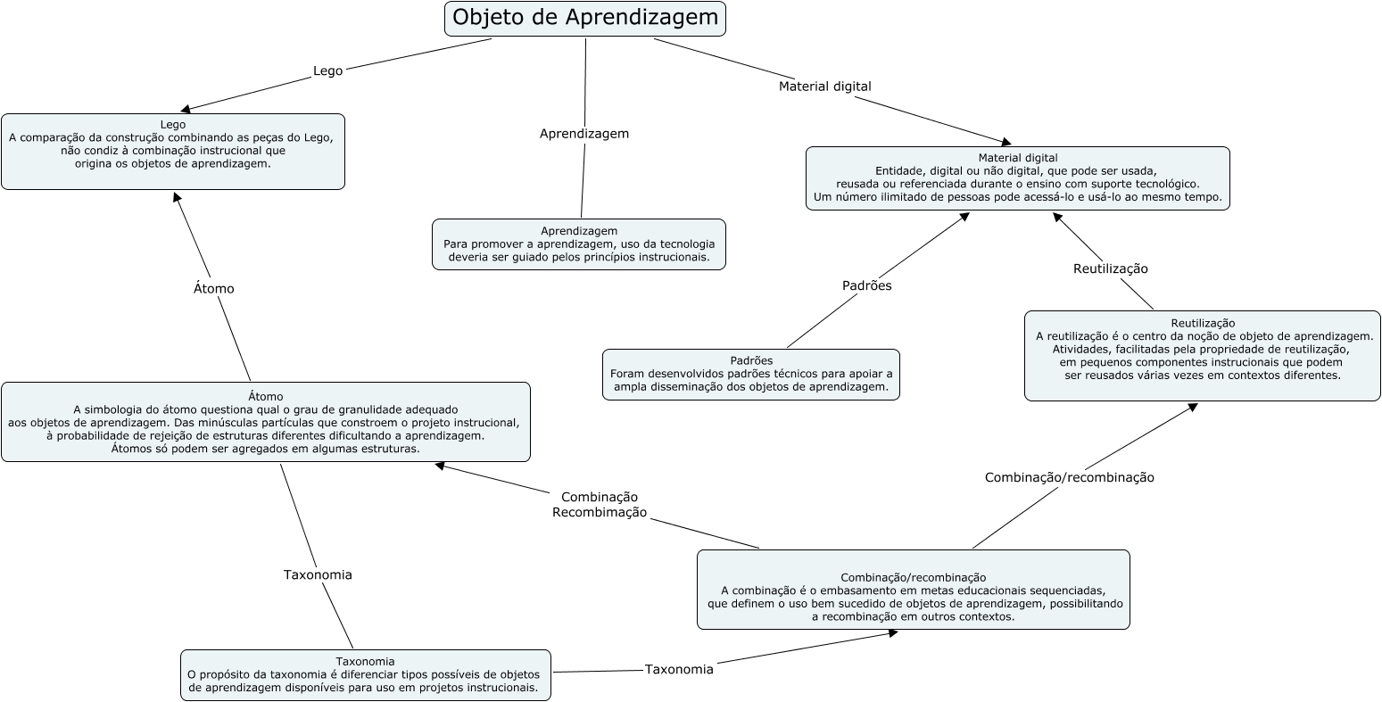 Esse mapa conceitual, produzido no IHMC CmapTools, tem a informação relacionada a: Refletindo sobre objetos de aprendizagem, Padrões Foram desenvolvidos padrões técnicos para apoiar a ampla disseminação dos objetos de aprendizagem. Padrões Material digital Entidade, digital ou não digital, que pode ser usada, reusada ou referenciada durante o ensino com suporte tecnológico. Um número ilimitado de pessoas pode acessá-lo e usá-lo ao mesmo tempo., Taxonomia O propósito da taxonomia é diferenciar tipos possíveis de objetos de aprendizagem disponíveis para uso em projetos instrucionais. Taxonomia Combinação/recombinação A combinação é o embasamento em metas educacionais sequenciadas, que definem o uso bem sucedido de objetos de aprendizagem, possibilitando a recombinação em outros contextos., Combinação/recombinação A combinação é o embasamento em metas educacionais sequenciadas, que definem o uso bem sucedido de objetos de aprendizagem, possibilitando a recombinação em outros contextos. Combinação Recombimação Átomo A simbologia do átomo questiona qual o grau de granulidade adequado aos objetos de aprendizagem. Das minúsculas partículas que constroem o projeto instrucional, à probabilidade de rejeição de estruturas diferentes dificultando a aprendizagem. Átomos só podem ser agregados em algumas estruturas., Combinação/recombinação A combinação é o embasamento em metas educacionais sequenciadas, que definem o uso bem sucedido de objetos de aprendizagem, possibilitando a recombinação em outros contextos. Combinação/recombinação Reutilização A reutilização é o centro da noção de objeto de aprendizagem. Atividades, facilitadas pela propriedade de reutilização, em pequenos componentes instrucionais que podem ser reusados várias vezes em contextos diferentes., Átomo A simbologia do átomo questiona qual o grau de granulidade adequado aos objetos de aprendizagem. Das minúsculas partículas que constroem o projeto instrucional, à probabilidade de rejeição de estruturas diferentes dificultando a aprendizagem. Átomos só podem ser agregados em algumas estruturas. Taxonomia Taxonomia O propósito da taxonomia é diferenciar tipos possíveis de objetos de aprendizagem disponíveis para uso em projetos instrucionais., Objeto de Aprendizagem Material digital Material digital Entidade, digital ou não digital, que pode ser usada, reusada ou referenciada durante o ensino com suporte tecnológico. Um número ilimitado de pessoas pode acessá-lo e usá-lo ao mesmo tempo., Átomo A simbologia do átomo questiona qual o grau de granulidade adequado aos objetos de aprendizagem. Das minúsculas partículas que constroem o projeto instrucional, à probabilidade de rejeição de estruturas diferentes dificultando a aprendizagem. Átomos só podem ser agregados em algumas estruturas. Átomo Lego A comparação da construção combinando as peças do Lego, não condiz à combinação instrucional que origina os objetos de aprendizagem., Objeto de Aprendizagem Lego Lego A comparação da construção combinando as peças do Lego, não condiz à combinação instrucional que origina os objetos de aprendizagem., Objeto de Aprendizagem Aprendizagem Aprendizagem Para promover a aprendizagem, uso da tecnologia deveria ser guiado pelos princípios instrucionais., Reutilização A reutilização é o centro da noção de objeto de aprendizagem. Atividades, facilitadas pela propriedade de reutilização, em pequenos componentes instrucionais que podem ser reusados várias vezes em contextos diferentes. Reutilização Material digital Entidade, digital ou não digital, que pode ser usada, reusada ou referenciada durante o ensino com suporte tecnológico. Um número ilimitado de pessoas pode acessá-lo e usá-lo ao mesmo tempo.
