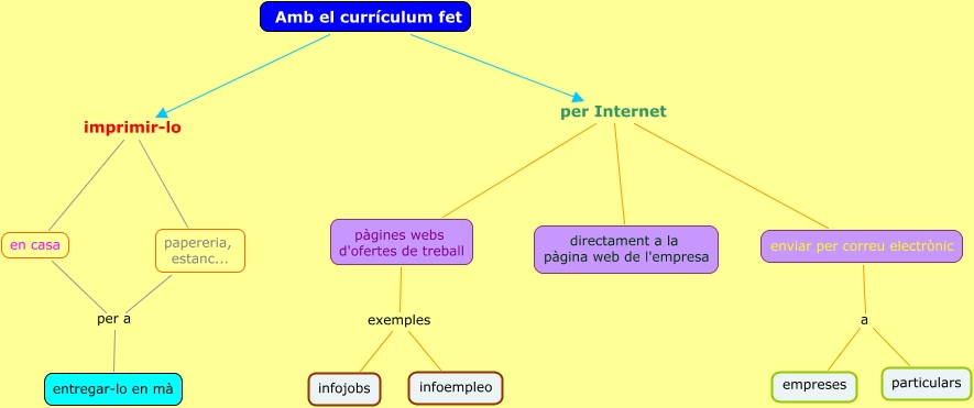 Aquest mapa conceptual conté informació relacionada amb: treball, Amb el currículum fet imprimir-lo papereria, estanc..., enviar per correu electrònic a particulars, Amb el currículum fet per Internet directament a la pàgina web de l'empresa, enviar per correu electrònic a empreses, papereria, estanc... per a entregar-lo en mà, Amb el currículum fet imprimir-lo en casa, Amb el currículum fet per Internet pàgines webs d'ofertes de treball, pàgines webs d'ofertes de treball exemples infojobs, en casa per a entregar-lo en mà, Amb el currículum fet per Internet enviar per correu electrònic, pàgines webs d'ofertes de treball exemples infoempleo