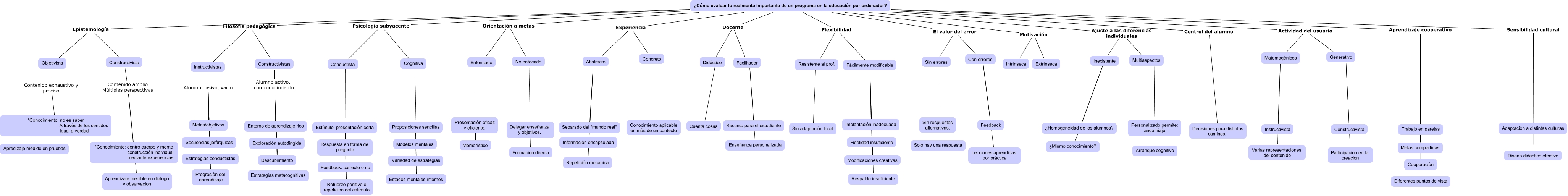 Este Cmap, tiene información relacionada con: Importancia de una educación por ordenador, ¿Cómo evaluar lo realmente importante de un programa en la educación por ordenador? Flexibilidad Resistente al prof., Instructivistas Alumno pasivo, vacío Metas/objetivos, ¿Cómo evaluar lo realmente importante de un programa en la educación por ordenador? Ajuste a las diferencias individuales Inexistente, Fácilmente modificable ???? Implantación inadecuada, Cognitiva ???? Proposiciones sencillas, Resistente al prof. ???? Sin adaptación local, Inexistente ???? ¿Mismo conocimiento?, ¿Cómo evaluar lo realmente importante de un programa en la educación por ordenador? El valor del error Sin errores, *Conocimiento: no es saber A través de los sentidos Igual a verdad ???? Apredizaje medido en pruebas, Inexistente ???? ¿Homogeneidad de los alumnos?, ¿Cómo evaluar lo realmente importante de un programa en la educación por ordenador? Sensibilidad cultural Adaptación a distintas culturas, Fácilmente modificable ???? Fidelidad insuficiente, Proposiciones sencillas ???? Modelos mentales, Abstracto ???? Separado del "mundo real", Estímulo: presentación corta ???? Refuerzo positivo o repetición del estímulo, Constructivistas Alumno activo, con conocimiento Descubrimiento, ¿Cómo evaluar lo realmente importante de un programa en la educación por ordenador? Motivación Extrínseca, Sin errores ???? Sin respuestas alternativas., Con errores ???? Lecciones aprendidas por práctica, ¿Cómo evaluar lo realmente importante de un programa en la educación por ordenador? Ajuste a las diferencias individuales Multiaspectos