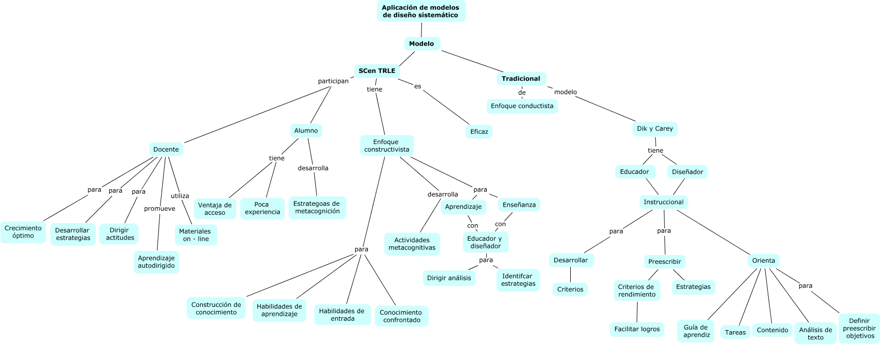 Este Cmap, tiene información relacionada con: Aplicación de modelos de diseño sistemático, Alumno tiene Poca experiencia, Educador ???? Instruccional, Diseñador ???? Instruccional, Educador y diseñador para Dirigir análisis, SCen TRLE es Eficaz, Orienta ???? Guía de aprendiz, Dik y Carey tiene Educador, Docente promueve Aprendizaje autodirigido, Instruccional ???? Orienta, Enfoque constructivista desarrolla Actividades metacognitivas, Modelo ???? SCen TRLE, Instruccional para Preescribir, Dik y Carey tiene Diseñador, Enfoque constructivista para Enseñanza, Modelo ???? Tradicional, Desarrollar ???? Criterios, Enfoque constructivista para Aprendizaje, Orienta ???? Análisis de texto, Orienta ???? Contenido, Educador y diseñador para Identifcar estrategias