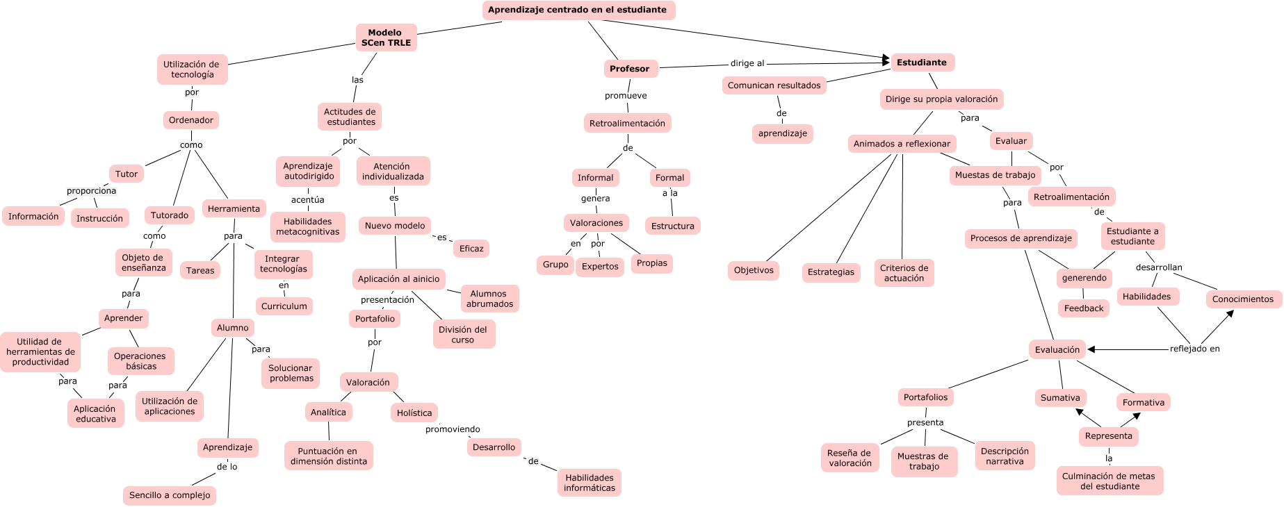 Este Cmap, tiene información relacionada con: Apredizaje centrado en el estudiante, Muestas de trabajo para Procesos de aprendizaje, Representa la Culminación de metas del estudiante, Valoración ???? Analítica, Valoraciones por Expertos, Evaluar ???? Muestas de trabajo, Modelo SCen TRLE las Actitudes de estudiantes, Ordenador como Tutor, Estudiante a estudiante ???? generendo, Aprendizaje centrado en el estudiante ???? Modelo SCen TRLE, Herramienta para Integrar tecnologías, Retroalimentación de Formal, Formal a la Estructura, Portafolios presenta Descripción narrativa, Objeto de enseñanza para Aprender, Nuevo modelo ???? Aplicación al ainicio, Holística promoviendo Desarrollo, Informal genera Valoraciones, Retroalimentación de Informal, Alumno para Solucionar problemas, Actitudes de estudiantes por Aprendizaje autodirigido