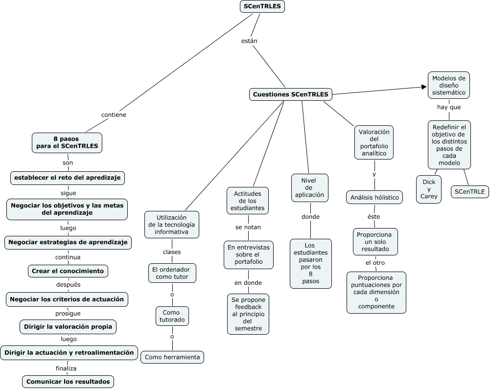 Este Cmap, tiene información relacionada con: mapa 5 SCenTRLES, establecer el reto del apredizaje sigue Negociar los objetivos y las metas del aprendizaje, Redefinir el objetivo de los distintos pasos de cada modelo ???? SCenTRLE, SCenTRLES están Cuestiones SCenTRLES, Dirigir la valoración propia luego Dirigir la actuación y retroalimentación, Cuestiones SCenTRLES ???? Modelos de diseño sistemático, Cuestiones SCenTRLES ???? Nivel de aplicación, En entrevistas sobre el portafolio en donde Se propone feedback al principio del semestre, Dirigir la actuación y retroalimentación finaliza Comunicar los resultados, Cuestiones SCenTRLES ???? Valoración del portafolio analítico, Cuestiones SCenTRLES ???? Actitudes de los estudiantes, SCenTRLES contiene 8 pasos para el SCenTRLES, Cuestiones SCenTRLES ???? Utilización de la tecnología informativa, Negociar los criterios de actuación prosigue Dirigir la valoración propia, Análisis hólistico éste Proporciona un solo resultado, Utilización de la tecnología informativa clases El ordenador como tutor, 8 pasos para el SCenTRLES son establecer el reto del apredizaje, Nivel de aplicación donde Los estudiantes pasaron por los 8 pasos, Modelos de diseño sistemático hay que Redefinir el objetivo de los distintos pasos de cada modelo, Negociar estrategias de aprendizaje continua Crear el conocimiento, Valoración del portafolio analítico y Análisis hólistico