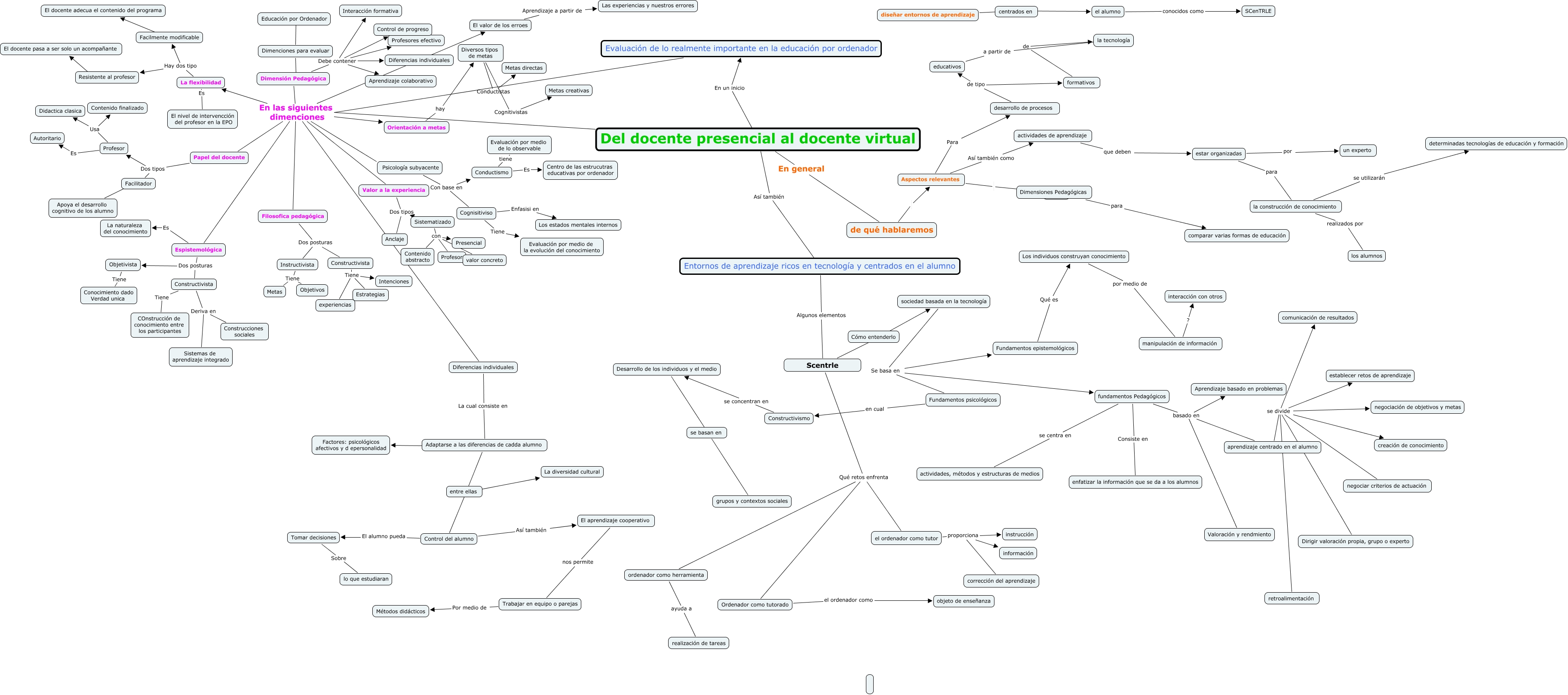 Este Cmap, tiene información relacionada con: PAIDOS4622EQUIPO3, Conductismo Es Centro de las estrucutras educativas por ordenador, Del docente presencial al docente virtual En las siguientes dimenciones Orientación a metas, Del docente presencial al docente virtual En las siguientes dimenciones Psicología subyacente, Control del alumno El alumno pueda Tomar decisiones, ordenador como herramienta ayuda a realización de tareas, Entornos de aprendizaje ricos en tecnología y centrados en el alumno Algunos elementos Scentrle, Aspectos relevantes Así también como actividades de aprendizaje, Del docente presencial al docente virtual En las siguientes dimenciones Diferencias individuales, Sistematizado con Contenido abstracto, diseñar entornos de aprendizaje el alumno, la construcción de conocimiento realizados por los alumnos, Profesor Usa Contenido finalizado, Dimensión Pedagógica Debe contener Diferencias individuales, sociedad basada en la tecnología Se basa en Fundamentos epistemológicos, Adaptarse a las diferencias de cadda alumno La diversidad cultural, Del docente presencial al docente virtual Así también Entornos de aprendizaje ricos en tecnología y centrados en el alumno, Adaptarse a las diferencias de cadda alumno Control del alumno, Objetivista Tiene Conocimiento dado Verdad unica, La flexibilidad Hay dos tipo Facilmente modificable, Dimensión Pedagógica Debe contener Interacción formativa