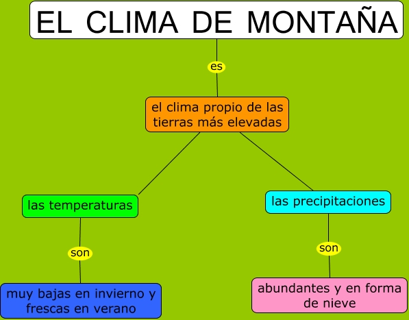 Este Cmap, tiene información relacionada con: El clima de montaña, las precipitaciones son abundantes y en forma de nieve, el clima propio de las tierras más elevadas las precipitaciones, EL CLIMA DE MONTAÑA es el clima propio de las tierras más elevadas, el clima propio de las tierras más elevadas las temperaturas, las temperaturas son muy bajas en invierno y frescas en verano