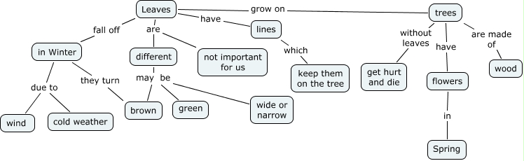 This Concept Map, created with IHMC CmapTools, has information related to: Elise Leaves, trees without leaves get hurt and die, in Winter they turn brown, in Winter due to wind, different may be green, trees have flowers, trees are made of wood, lines which keep them on the tree, Leaves grow on trees, in Winter due to cold weather, Leaves have lines, different may be brown, Leaves are not important for us, different may be wide or narrow, Leaves fall off in Winter, Leaves are different, flowers in Spring