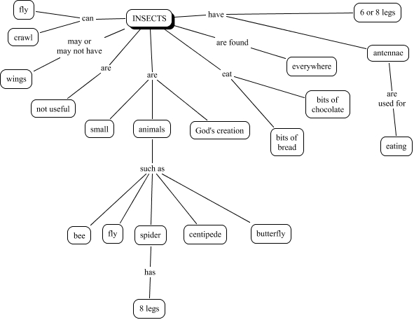 This Concept Map, created with IHMC CmapTools, has information related to: Peppijna 4 paper, INSECTS have 6 or 8 legs, INSECTS are small, INSECTS are animals, animals such as butterfly, antennae are used for eating, animals such as centipede, animals such as bee, animals such as fly, INSECTS have antennae, spider has 8 legs, INSECTS are found everywhere, INSECTS eat bits of chocolate, INSECTS are not useful, INSECTS can crawl, INSECTS are God's creation, INSECTS eat bits of bread, INSECTS can fly, animals such as spider, INSECTS may or may not have wings