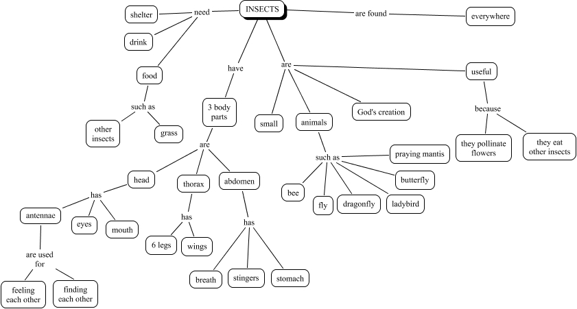 This Concept Map, created with IHMC CmapTools, has information related to: Peppijna2 4 paper, antennae are used for feeling each other, INSECTS are God's creation, animals such as butterfly, head has antennae, abdomen has stingers, INSECTS are found everywhere, thorax has 6 legs, abdomen has stomach, INSECTS need drink, animals such as bee, INSECTS have 3 body parts, abdomen has breath, antennae are used for finding each other, INSECTS need food, food such as grass, food such as other insects, INSECTS are small, head has eyes, INSECTS are useful, animals such as ladybird