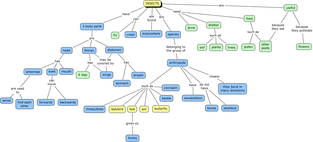 This Concept Map, created with IHMC CmapTools, has information related to: katrina 2, shelter such as trees, INSECTS have 3 body parts, INSECTS are found everywhere, INSECTS can fly, INSECTS are species, INSECTS can crawl, useful because they eat other pests, arthropods such as ladybird, food such as other pests, antennae are used to sense, arthropods such as butterfly, useful because they pollinate flowers, shelter such as plants, head has eyes, bee gives us honey, antennae are used to find each other, arthropods do not have bones, arthropods means they bend in many directions, head has mouth, abdomen may be covered by wings