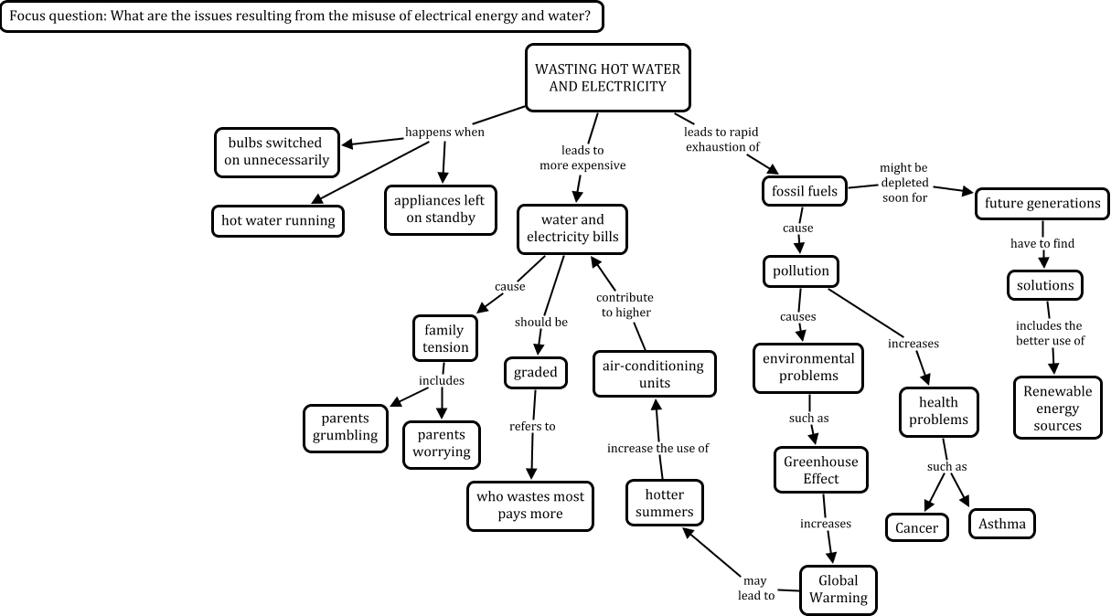 This Concept Map, created with IHMC CmapTools, has information related to: Wasting hot water 4.4.1.cmap, WASTING HOT WATER AND ELECTRICITY leads to rapid exhaustion of fossil fuels, water and electricity bills should be graded, Global Warming may lead to hotter summers, pollution causes environmental problems, air-conditioning units contribute to higher water and electricity bills, fossil fuels might be depleted soon for future generations, WASTING HOT WATER AND ELECTRICITY happens when hot water running, family tension includes parents grumbling, future generations have to find solutions, water and electricity bills cause family tension, graded refers to who wastes most pays more, WASTING HOT WATER AND ELECTRICITY happens when bulbs switched on unnecessarily, solutions includes the better use of Renewable energy sources, WASTING HOT WATER AND ELECTRICITY happens when appliances left on standby, family tension includes parents worrying, health problems such as Cancer, Greenhouse Effect increases Global Warming, hotter summers increase the use of air-conditioning units, health problems such as Asthma, environmental problems such as Greenhouse Effect