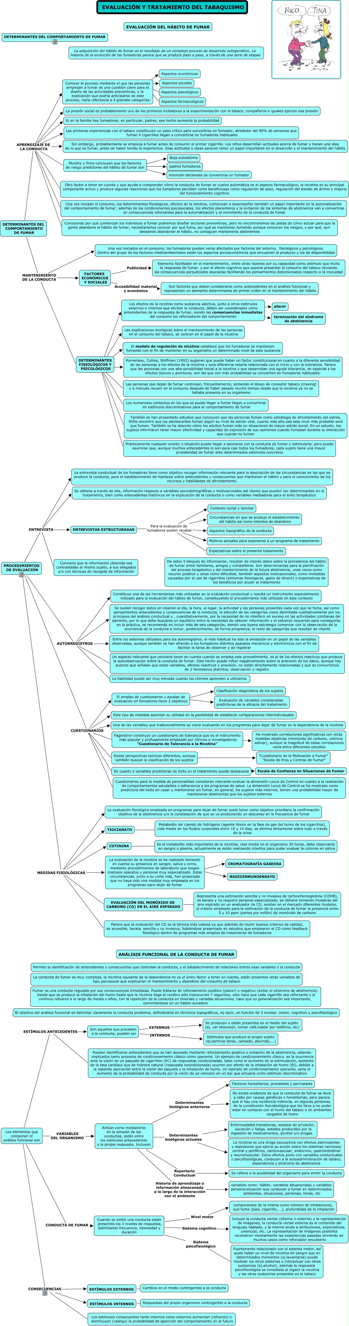 Este Cmap, tiene información relacionada con: MAPA_RESUMEN_INTERVENCION_Y_SALUD_10, PROCEDIMIENTOS DE EVALUACIÓN ENTREVISTA Se obtiene a través de ella, información respecto a variables sociodemográficas y motivacionales del cliente que pueden ser determinantes en el tratamiento, bien como antecedentes históricos en la explicación de la conducta o como variables mediadoras para el éxito terapéutico., DETERMINANTES DEL COMPORTAMIENTO DE FUMAR APRENDIZAJE DE LA CONDUCTA Si en la familia hay fumadores, en particular, padres, ese hecho aumenta la probabilidad, PROCEDIMIENTOS DE EVALUACIÓN CUESTIONARIOS Desde perspectivas teóricas diferentes, aunque también buscan la clasificación de los sujetos, La evaluación de la nicotina se ha realizado teniendo en cuenta su presencia en sangre, saliva y orina, mediante procedimientos de laboratorio que exigen costosos aparatos y personal muy especializado. Estas circunstancias, junto a su corta vida, han propiciado que no haya sido una medida muy empleada en los programas para dejar de fumar ???? CROMATOGRAFÍA GASEOSA, DETERMINANTES FISIOLÓGICOS Y PSICOLÓGICOS ???? También se han presentado estudios que concluyen que las personas fuman como estrategia de afrontamiento del estrés, Willis encontró que los adolescentes fuman según su nivel de estrés vital, cuanto más alto sea este nivel más probable será que fumen. También se ha descrito cómo los adultos fuman más en situaciones de mayor estrés social. En un estudio, los sujetos informaron tener mayor efectividad y capacidad de expresión de sus opiniones cuando fumaban durante la interacción que cuando no fuman, PROCEDIMIENTOS DE EVALUACIÓN MEDIDAS FISIOLÓGICAS La evaluación de la nicotina se ha realizado teniendo en cuenta su presencia en sangre, saliva y orina, mediante procedimientos de laboratorio que exigen costosos aparatos y personal muy especializado. Estas circunstancias, junto a su corta vida, han propiciado que no haya sido una medida muy empleada en los programas para dejar de fumar, COTININA ???? Es el metabolito más importante de la nicotina, vida media en el organismo 20 horas, debe observarse en sangre o plasma, actualmente se están realizando intentos para poder evaluar la cotinina en saliva, DETERMINANTES DEL COMPORTAMIENTO DE FUMAR MANTENIMIENTO DE LA CONDUCTA DETERMINANTES FISIOLÓGICOS Y PSICOLÓGICOS, PROCEDIMIENTOS DE EVALUACIÓN AUTORREGISTROS Entre los sistemas utilizados para los autorregistros, el más habitual ha sido la anotación en un papel de las variables observadas, aunque también se han ofrecido a los fumadores distintos aparatos mecánicos y electrónicos con el fin de facilitar la tarea de observar y de registrar, PROCEDIMIENTOS DE EVALUACIÓN CUESTIONARIOS Cuestionarios para la medida de personalidad consideran relevante evaluar la dimensión Locus de Control en cuanto a la realización de comportamientos saludables o adherencia a los programas de salud. La dimensión Locus de Control se ha mostrado como predictora del éxito en cesar y mantenerse sin fumar, en general, los sujetos más internos, tienen una probabilidad mayor de mantenerse abstinentes que los sujetos externos, El empleo de cuestionarios y escalas de evaluación en fumadores tiene 2 objetivos ???? Evaluación de variables consideradas predictoras de la eficacia del tratamiento, DETERMINANTES FISIOLÓGICOS Y PSICOLÓGICOS ???? Las personas que dejan de fumar continúan, frecuentemente, sintiendo el deseo de consumir tabaco (craving) y a menudo recaen en el consumo después de haber pasado mucho tiempo desde que la nicotina ya no se hallaba presente en su organismo, DETERMINANTES FISIOLÓGICOS Y PSICOLÓGICOS ???? Las explicaciones biológicas sobre el mantenimiento de las personas en el consumo del tabaco, se centran en el papel de la nicotina., PROCEDIMIENTOS DE EVALUACIÓN MEDIDAS FISIOLÓGICAS Parece que la evaluación del CO es la técnica más valiosa ya que además de reunir buenos criterios de calidad, es accesible, barata, sencilla y no invasiva, habiéndose presentado en estudios que emplearon el CO como feedback fisiológico dentro de programas más amplios de tratamiento de fumadores, ENTREVISTAS ESTRUCTURADAS Para la evaluación de fumadores suelen recabar Contexto social y familiar, Actúan como mediadoras en la emisión de las conductas, están entre los estímulos antecedentes y la propia respuesta. Incluyen Determinantes biológicos actuales La nicotina es una droga psicoactiva con efectos estimulantes y depresores que ejerce su acción sobre los sistemas nerviosos central y periférico, cardiovascular, endocrino, gastrointestinal y neuromuscular. Estos efectos junto con variables conductuales y psicofisiológicas, conducen a la autoadministración de tabaco, dependencia y síndrome de abstinencia, ENTREVISTAS ESTRUCTURADAS Para la evaluación de fumadores suelen recabar Aspectos topográfico de la conducta, Los elementos que componen el análisis funcional son CONDUCTA DE FUMAR Cuando se emite una conducta están presentes los 3 niveles de respuesta, delimitando frecuencia, intensidad y duración, DETERMINANTES FISIOLÓGICOS Y PSICOLÓGICOS ???? Los efectos de la nicotina como sustancia adictiva, junto a otros estímulos externos e internos que elicitan la conducta, deben ser considerados como antecedentes de la respuesta de fumar, siendo las consecuencias inmediatas del consumo los reforzadores del comportamiento, DETERMINANTES DEL COMPORTAMIENTO DE FUMAR APRENDIZAJE DE LA CONDUCTA Conocer el proceso mediante el que las personas empiezan a fumar es una cuestión clave para el diseño de las actividades preventivas, y la explicación que podría anticiparse de este proceso, haría referencia a 4 grandes categorías: