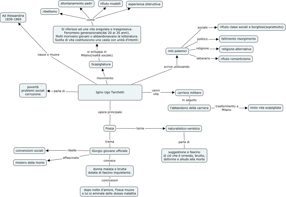 Questa Cmap, creata con IHMC CmapTools, contiene informazioni relative a: Tarchetti(Scapigliatura), Giorgio giovane ufficiale conosce donna malata e brutta dotata di fascino inquietante., Giorgio giovane ufficiale ribelle convenzioni sociali, Giorgio giovane ufficiale affascinato mistero della morte, Scapigliatura si sviluppa in Milano(realtà sociale) Si riferisce ad una vita sregolata e trasgressiva. Fenomeno generazionale(dai 20 ai 35 anni). Molti morivano giovani o abbandonavano la letteratura. Scelta di vita costituiscono una casta con unità d'intenti:, Igino Ugo Tarchetti movimento Scapigliatura, Si riferisce ad una vita sregolata e trasgressiva. Fenomeno generazionale(dai 20 ai 35 anni). Molti morivano giovani o abbandonavano la letteratura. Scelta di vita costituiscono una casta con unità d'intenti: come esperienza distruttiva, Si riferisce ad una vita sregolata e trasgressiva. Fenomeno generazionale(dai 20 ai 35 anni). Molti morivano giovani o abbandonavano la letteratura. Scelta di vita costituiscono una casta con unità d'intenti: come allontanamento padri, miti polemici letterario rifiuto romanticismo, carriera militare in seguito l'abbandono della carriera, miti polemici politico fallimento risorgimento, Fosca trama Giorgio giovane ufficiale, miti polemici religione religione alternativa, Si riferisce ad una vita sregolata e trasgressiva. Fenomeno generazionale(dai 20 ai 35 anni). Molti morivano giovani o abbandonavano la letteratura. Scelta di vita costituiscono una casta con unità d'intenti: come ribellismo, l'abbandono della carriera trasferimento a Milano inizio vita scapigliata, Igino Ugo Tarchetti scrive utilizzando miti polemici, donna malata e brutta dotata di fascino inquietante. conclusioni dopo notte d'amore, Fosca muore e lui si ammala delle stessa malattia, Igino Ugo Tarchetti parla di povertà problemi sociali corruzione, Si riferisce ad una vita sregolata e trasgressiva. Fenomeno generazionale(dai 20 ai 35 anni). Molti morivano giovani o abbandonavano la letteratura. Scelta di vita costituiscono una casta con unità d'intenti: come rifiuto modelli, miti polemici sociale rifiuto classi sociali e borghesi(soprattutto), Igino Ugo Tarchetti opera principale Fosca