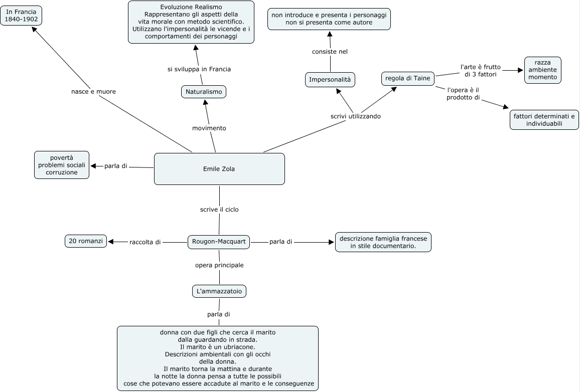 Questa Cmap, creata con IHMC CmapTools, contiene informazioni relative a: Emile Zola, Emile Zola scrivi utilizzando Impersonalità, Emile Zola movimento Naturalismo, Emile Zola scrivi utilizzando regola di Taine, Naturalismo si sviluppa in Francia Evoluzione Realismo Rappresentano gli aspetti della vita morale con metodo scientifico. Utilizzano l'impersonalità le vicende e i comportamenti dei personaggi, L'ammazzatoio parla di donna con due figli che cerca il marito dalla guardando in strada. Il marito è un ubriacone. Descrizioni ambientali con gli occhi della donna. Il marito torna la mattina e durante la notte la donna pensa a tutte le possibili cose che potevano essere accadute al marito e le conseguenze, Emile Zola nasce e muore In Francia 1840-1902, Impersonalità consiste nel non introduce e presenta i personaggi non si presenta come autore, Emile Zola parla di povertà problemi sociali corruzione, Rougon-Macquart opera principale L'ammazzatoio, Rougon-Macquart raccolta di 20 romanzi, regola di Taine l'arte è frutto di 3 fattori razza ambiente momento, regola di Taine l'opera è il prodotto di fattori determinati e individuabili, Emile Zola scrive il ciclo Rougon-Macquart, Rougon-Macquart parla di descrizione famiglia francese in stile documentario.