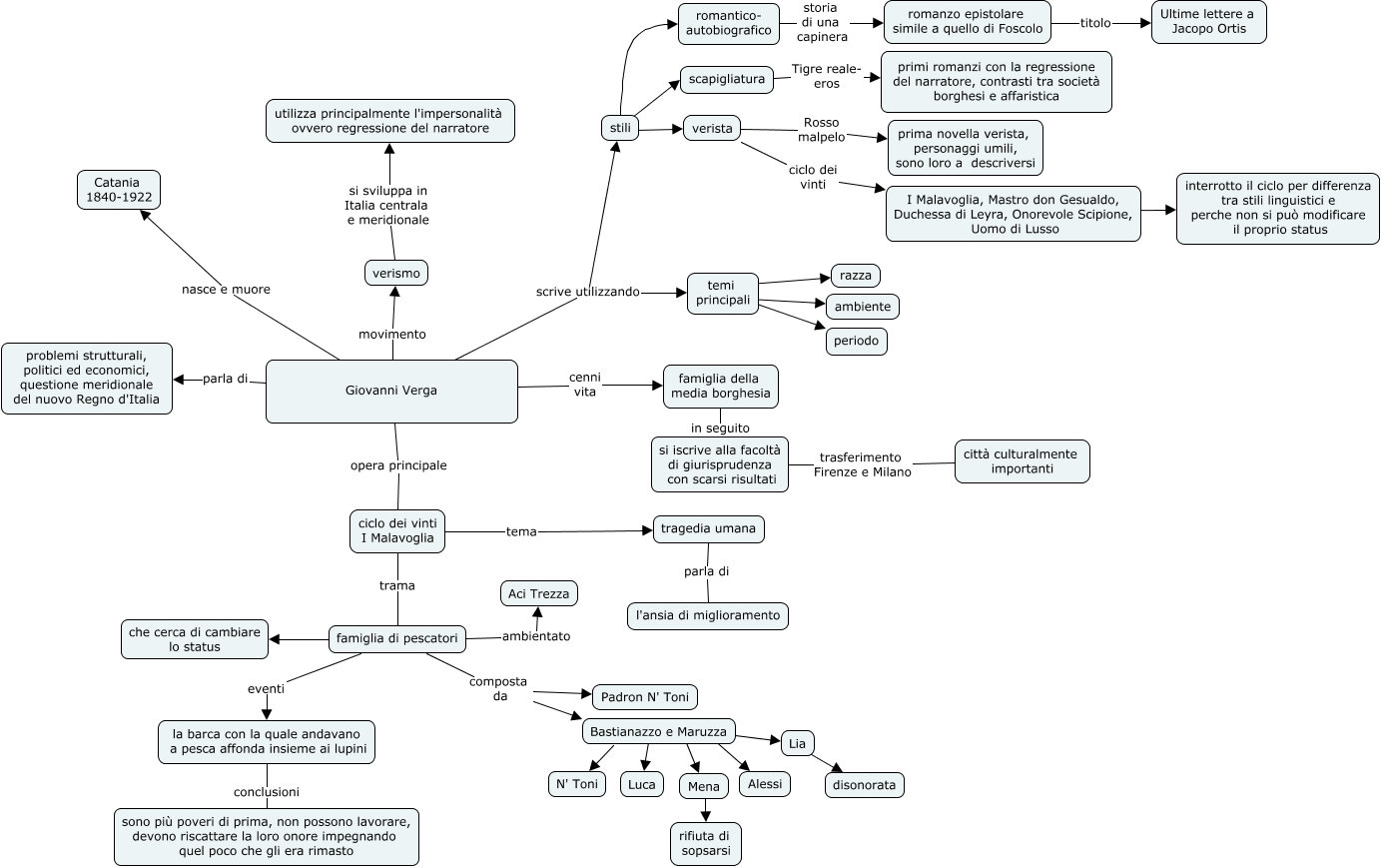 This Concept Map, created with IHMC CmapTools, has information related to: verga, Giovanni Verga nasce e muore Catania 1840-1922, si iscrive alla facoltà di giurisprudenza con scarsi risultati trasferimento Firenze e Milano città culturalmente importanti, Bastianazzo e Maruzza ???? N' Toni, verismo si sviluppa in Italia centrala e meridionale utilizza principalmente l'impersonalità ovvero regressione del narratore, Giovanni Verga opera principale ciclo dei vinti I Malavoglia, temi principali ???? ambiente, famiglia di pescatori composta da Bastianazzo e Maruzza, Bastianazzo e Maruzza ???? Mena, Bastianazzo e Maruzza ???? Lia, verista ciclo dei vinti I Malavoglia, Mastro don Gesualdo, Duchessa di Leyra, Onorevole Scipione, Uomo di Lusso, la barca con la quale andavano a pesca affonda insieme ai lupini conclusioni sono più poveri di prima, non possono lavorare, devono riscattare la loro onore impegnando quel poco che gli era rimasto, Mena ???? rifiuta di sopsarsi, stili ???? scapigliatura, Giovanni Verga scrive utilizzando temi principali, scapigliatura Tigre reale- eros primi romanzi con la regressione del narratore, contrasti tra società borghesi e affaristica, famiglia della media borghesia in seguito si iscrive alla facoltà di giurisprudenza con scarsi risultati, Bastianazzo e Maruzza ???? Luca, famiglia di pescatori ambientato Aci Trezza, Giovanni Verga movimento verismo, Lia ???? disonorata