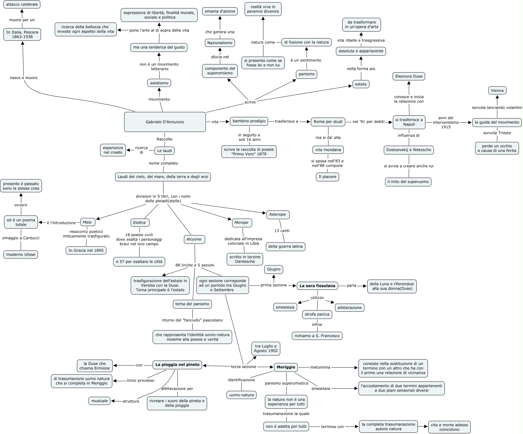 Questa Cmap, creata con IHMC CmapTools, contiene informazioni relative a: Gabriele D'Annunzio, Gabriele D'Annunzio Raccolte Le laudi, Elettra 18 poesie civili dove esalta i personaggi bravi nel loro campo e 57 per esaltare le città, Merope dedicata all'impresa coloniale in Libia scritto in terzine Dantesche, Maia è l'introduzione ed è un poema totale, La pioggia nel pineto inizio processo di trasumazione uomo natura che si completa in Meriggio, Alcyone 88 liriche e 5 sezioni ogni sezione corrisponde ad un periodo tra Giugno e Settembre, di fusione con la natura natura come realtà viva in perenne divenire, la guida del movimento sorvola lanciando volantini Vienna, componente del superomismo sfocia nel Nazionalismo, si trasferisce a Napoli influenza di Dostoevskij e Nietzsche, Meriggio metonimia consiste nella sostituzione di un termine con un altro che ha con il primo una relazione di vicinanza, Alcyone 88 liriche e 5 sezioni trasfigurazione dell'estate in Versilia con la Duse. Tema principale è l'estate, ed è un poema totale omaggio a Carducci moderno Ulisse, la guida del movimento sorvola Trieste perde un occhio a causa di una ferita, si trasferisce a Napoli anni del interventismo 1915 la guida del movimento, Le laudi ricerca di esperienze nel creato, La pioggia nel pineto con la Duse che chiama Ermione, Nazionalismo che genera una smania d'azione, Roma per studi ma si da' alla vita mondana, ogni sezione corrisponde ad un periodo tra Giugno e Settembre terza sezione tra Luglio e Agosto 1902