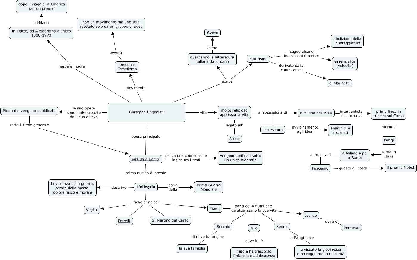 Questa Cmap, creata con IHMC CmapTools, contiene informazioni relative a: Ungaretti, prima linea in trincea sul Carso ritorno a Parigi, Fiumi parla dei 4 fiumi che caratterizzano la sua vita Isonzo, A Milano e poi a Roma abbraccia il Fascismo, Futurismo segue alcune indicazioni futuriste abolizione della punteggiatura, Giuseppe Ungaretti scrive Futurismo, molto religioso apprezza la vita legato all' Africa, Isonzo dove è immerso, Giuseppe Ungaretti opera principale Vita d'un uomo, Fiumi parla dei 4 fiumi che caratterizzano la sua vita Nilo, molto religioso apprezza la vita si appassiona di Letteratura, L'allegria liriche principali Veglia, Serchio di dove ha origine la sua famiglia, Giuseppe Ungaretti movimento precorre Ermetismo, L'allegria descrive la violenza della guerra, orrore della morte, dolore fisico e morale, L'allegria liriche principali Fratelli, Giuseppe Ungaretti le suo opere sono state raccolte da il suo allievo Piccioni e vengono pubblicate, Senna a Parigi dove a vissuto la giovinezza e ha raggiunto la maturità, a Milano nel 1914 interventista e si arruola prima linea in trincea sul Carso, Fiumi parla dei 4 fiumi che caratterizzano la sua vita Serchio, Fascismo questo gli costa il premio Nobel