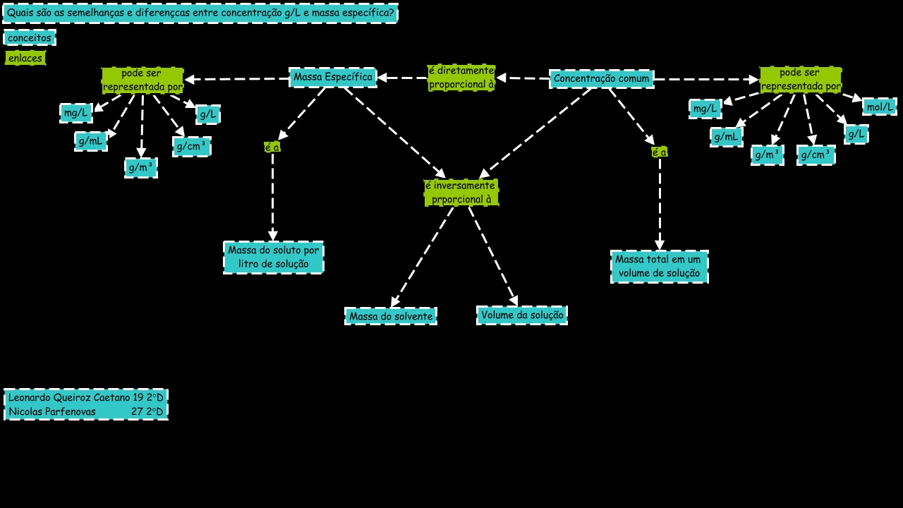 Esse mapa conceitual, produzido no IHMC CmapTools, tem a informação relacionada a: mapa nick e leo trab trimestras 2 + pampa's, Massa Específica pode ser representada por g/L, Massa Específica é inversamente prporcional à Volume da solução, Concentração comum pode ser representada por g/cm³, Concentração comum é inversamente prporcional à Volume da solução, Concentração comum é inversamente prporcional à Massa do solvente, Concentração comum pode ser representada por g/L, Concentração comum pode ser representada por mg/L, Massa Específica pode ser representada por g/m³, Massa Específica pode ser representada por g/cm³, Concentração comum pode ser representada por g/mL, Massa Específica pode ser representada por mg/L, Concentração comum pode ser representada por g/m³, Massa Específica é a Massa do soluto por litro de solução, Concentração comum é a Massa total em um volume de solução, Concentração comum pode ser representada por mol/L, Massa Específica pode ser representada por g/mL, Massa Específica é inversamente prporcional à Massa do solvente, Concentração comum é diretamente proporcional à Massa Específica