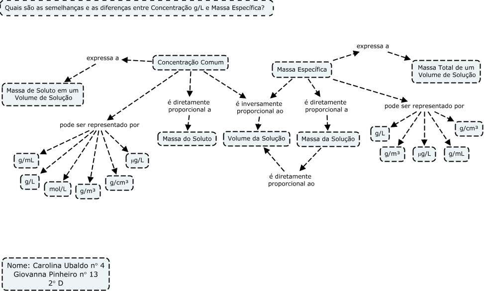 Esse mapa conceitual, produzido no IHMC CmapTools, tem a informação relacionada a: Carolina e Giovanna, Massa Específica pode ser representado por g/m³, Massa Específica é inversamente proporcional ao Volume da Solução, Massa Específica pode ser representado por g/L, Concentração Comum pode ser representado por mol/L, Massa da Solução é diretamente proporcional ao Volume da Solução, Concentração Comum expressa a Massa de Soluto em um Volume de Solução, Massa Específica pode ser representado por g/mL, Concentração Comum pode ser representado por g/m³, Massa Específica é diretamente proporcional a Massa da Solução, Concentração Comum pode ser representado por g/mL, Concentração Comum pode ser representado por g/cm³, Concentração Comum é inversamente proporcional ao Volume da Solução, Concentração Comum é diretamente proporcional a Massa do Soluto, Concentração Comum pode ser representado por g/L, Massa Específica pode ser representado por g/cm³, Massa Específica pode ser representado por μg/L, Concentração Comum pode ser representado por μg/L, Massa Específica expressa a Massa Total de um Volume de Solução