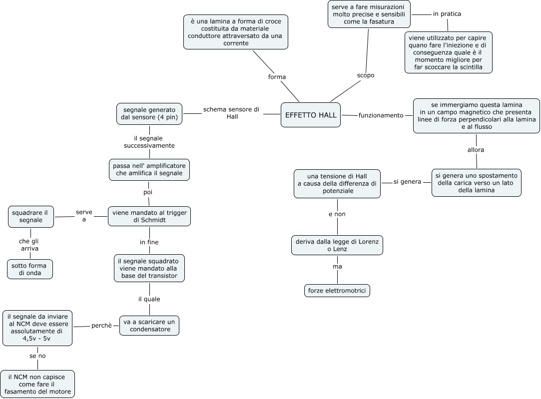 Questa Cmap, creata con IHMC CmapTools, contiene informazioni relative a: effetto hall, EFFETTO HALL scopo serve a fare misurazioni molto precise e sensibili come la fasatura, squadrare il segnale che gli arriva sotto forma di onda, serve a fare misurazioni molto precise e sensibili come la fasatura in pratica viene utilizzato per capire quano fare l'iniezione e di conseguenza quale è il momento migliore per far scoccare la scintilla, EFFETTO HALL forma è una lamina a forma di croce costituita da materiale conduttore attraversato da una corrente, si genera uno spostamento della carica verso un lato della lamina si genera una tensione di Hall a causa della differenza di potenziale, deriva dalla legge di Lorenz o Lenz ma forze elettromotrici, una tensione di Hall a causa della differenza di potenziale e non deriva dalla legge di Lorenz o Lenz, il segnale squadrato viene mandato alla base del transistor il quale va a scaricare un condensatore, passa nell' amplificatore che amlifica il segnale poi viene mandato al trigger di Schmidt, il segnale da inviare al NCM deve essere assolutamente di 4,5v - 5v se no il NCM non capisce come fare il fasamento del motore, segnale generato dal sensore (4 pin) il segnale successivamente passa nell' amplificatore che amlifica il segnale, se immergiamo questa lamina in un campo magnetico che presenta linee di forza perpendicolari alla lamina e al flusso allora si genera uno spostamento della carica verso un lato della lamina, viene mandato al trigger di Schmidt serve a squadrare il segnale, va a scaricare un condensatore perchè il segnale da inviare al NCM deve essere assolutamente di 4,5v - 5v, viene mandato al trigger di Schmidt in fine il segnale squadrato viene mandato alla base del transistor, EFFETTO HALL schema sensore di Hall segnale generato dal sensore (4 pin), EFFETTO HALL funzionamento se immergiamo questa lamina in un campo magnetico che presenta linee di forza perpendicolari alla lamina e al flusso