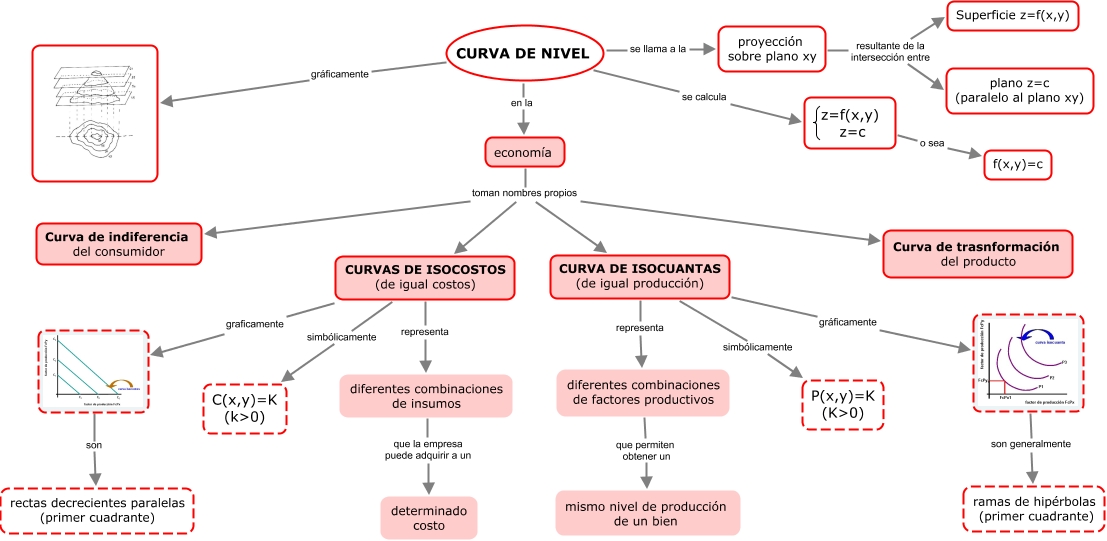 Este Cmap, tiene información relacionada con: CURVAS DE NIVEL, CURVA DE ISOCUANTAS (de igual producción) gráficamente, son generalmente ramas de hipérbolas (primer cuadrante), CURVA DE NIVEL se calcula <math xmlns="http://www.w3.org/1998/Math/MathML"> <mrow> <mfenced open="{" close=""> <mtext> z=f(x,y)