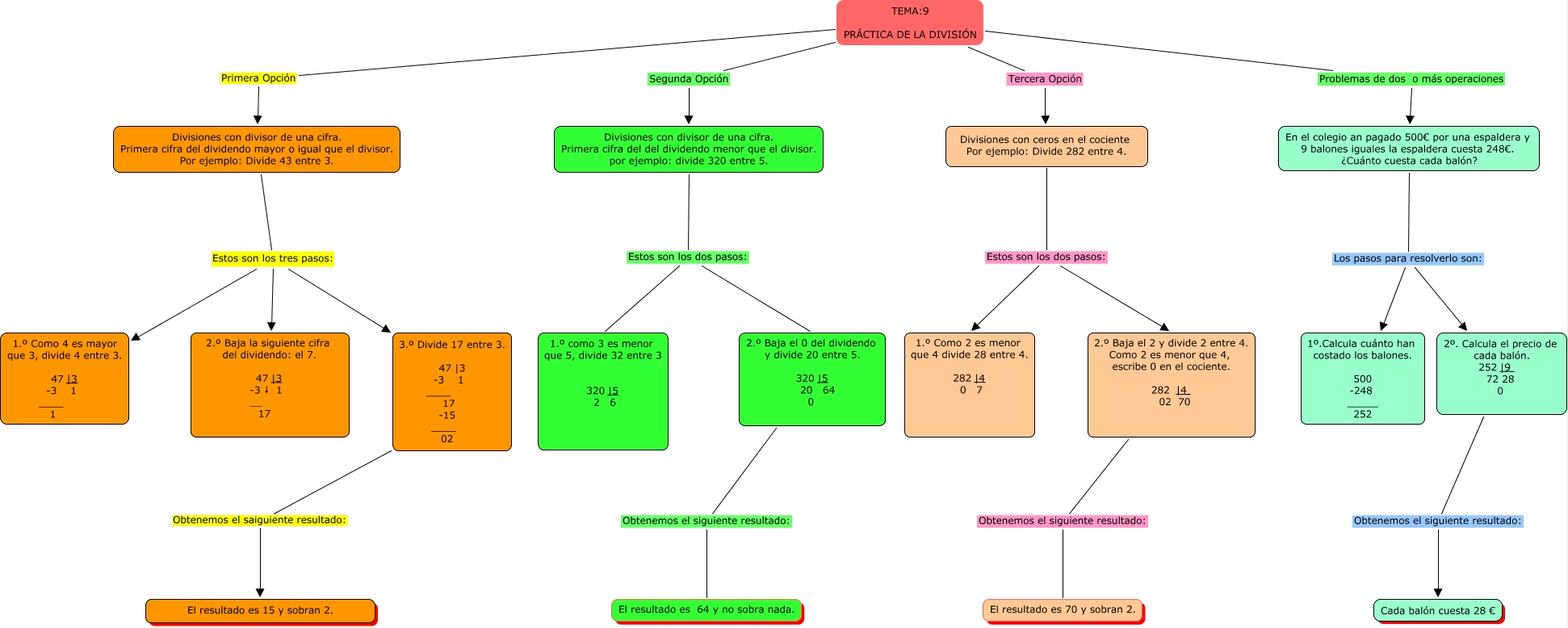Este Cmap, tiene información relacionada con: Matematicas Samuel, TEMA:9 PRÁCTICA DE LA DIVISIÓN Problemas de dos o más operaciones En el colegio an pagado 500€ por una espaldera y 9 balones iguales la espaldera cuesta 248€. ¿Cuánto cuesta cada balón?, TEMA:9 PRÁCTICA DE LA DIVISIÓN Primera Opción Divisiones con divisor de una cifra. Primera cifra del dividendo mayor o igual que el divisor. Por ejemplo: Divide 43 entre 3., Divisiones con divisor de una cifra. Primera cifra del dividendo mayor o igual que el divisor. Por ejemplo: Divide 43 entre 3. Estos son los tres pasos: 2.º Baja la siguiente cifra del dividendo: el 7. 47 |3 -3 ↓ 1 __ 17, 3.º Divide 17 entre 3. 47 |3 -3 1 ____ 17 -15 ____ 02 Obtenemos el saiguiente resultado: El resultado es 15 y sobran 2., Divisiones con divisor de una cifra. Primera cifra del del dividendo menor que el divisor. por ejemplo: divide 320 entre 5. Estos son los dos pasos: 1.º como 3 es menor que 5, divide 32 entre 3 320 |5 2 6, Divisiones con ceros en el cociente Por ejemplo: Divide 282 entre 4. Estos son los dos pasos: 2.º Baja el 2 y divide 2 entre 4. Como 2 es menor que 4, escribe 0 en el cociente. 282 |4 02 70, Divisiones con divisor de una cifra. Primera cifra del dividendo mayor o igual que el divisor. Por ejemplo: Divide 43 entre 3. Estos son los tres pasos: 1.º Como 4 es mayor que 3, divide 4 entre 3. 47 |3 -3 1 ____ 1, Divisiones con divisor de una cifra. Primera cifra del dividendo mayor o igual que el divisor. Por ejemplo: Divide 43 entre 3. Estos son los tres pasos: 3.º Divide 17 entre 3. 47 |3 -3 1 ____ 17 -15 ____ 02, TEMA:9 PRÁCTICA DE LA DIVISIÓN Tercera Opción Divisiones con ceros en el cociente Por ejemplo: Divide 282 entre 4., 2.º Baja el 2 y divide 2 entre 4. Como 2 es menor que 4, escribe 0 en el cociente. 282 |4 02 70 Obtenemos el siguiente resultado: El resultado es 70 y sobran 2., Divisiones con ceros en el cociente Por ejemplo: Divide 282 entre 4. Estos son los dos pasos: 1.º Como 2 es menor que 4 divide 28 entre 4. 282 |4 0 7, En el colegio an pagado 500€ por una espaldera y 9 balones iguales la espaldera cuesta 248€. ¿Cuánto cuesta cada balón? Los pasos para resolverlo son: 2º. Calcula el precio de cada balón. 252 |9 72 28 0, Divisiones con divisor de una cifra. Primera cifra del del dividendo menor que el divisor. por ejemplo: divide 320 entre 5. Estos son los dos pasos: 2.º Baja el 0 del dividendo y divide 20 entre 5. 320 |5 20 64 0, En el colegio an pagado 500€ por una espaldera y 9 balones iguales la espaldera cuesta 248€. ¿Cuánto cuesta cada balón? Los pasos para resolverlo son: 1º.Calcula cuánto han costado los balones. 500 -248 _____ 252, 2.º Baja el 0 del dividendo y divide 20 entre 5. 320 |5 20 64 0 Obtenemos el siguiente resultado: El resultado es 64 y no sobra nada., TEMA:9 PRÁCTICA DE LA DIVISIÓN Segunda Opción Divisiones con divisor de una cifra. Primera cifra del del dividendo menor que el divisor. por ejemplo: divide 320 entre 5., 2º. Calcula el precio de cada balón. 252 |9 72 28 0 Obtenemos el siguiente resultado: Cada balón cuesta 28 €