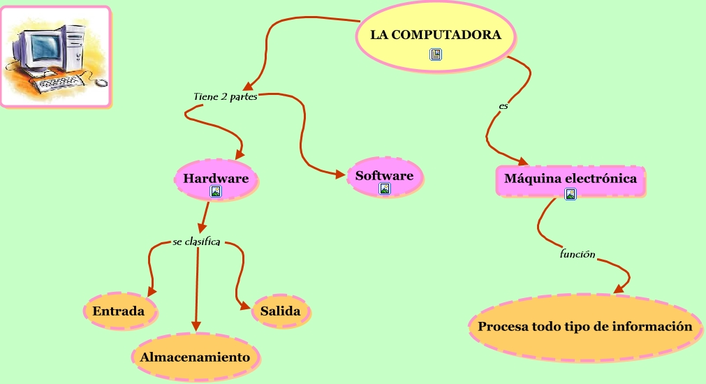 Este Cmap, tiene información relacionada con: la computadora, LA COMPUTADORA Tiene 2 partes Software, Hardware se clasifica Almacenamiento, LA COMPUTADORA es Máquina electrónica, LA COMPUTADORA Tiene 2 partes Hardware, Hardware se clasifica Salida, Máquina electrónica función Procesa todo tipo de información, Hardware se clasifica Entrada