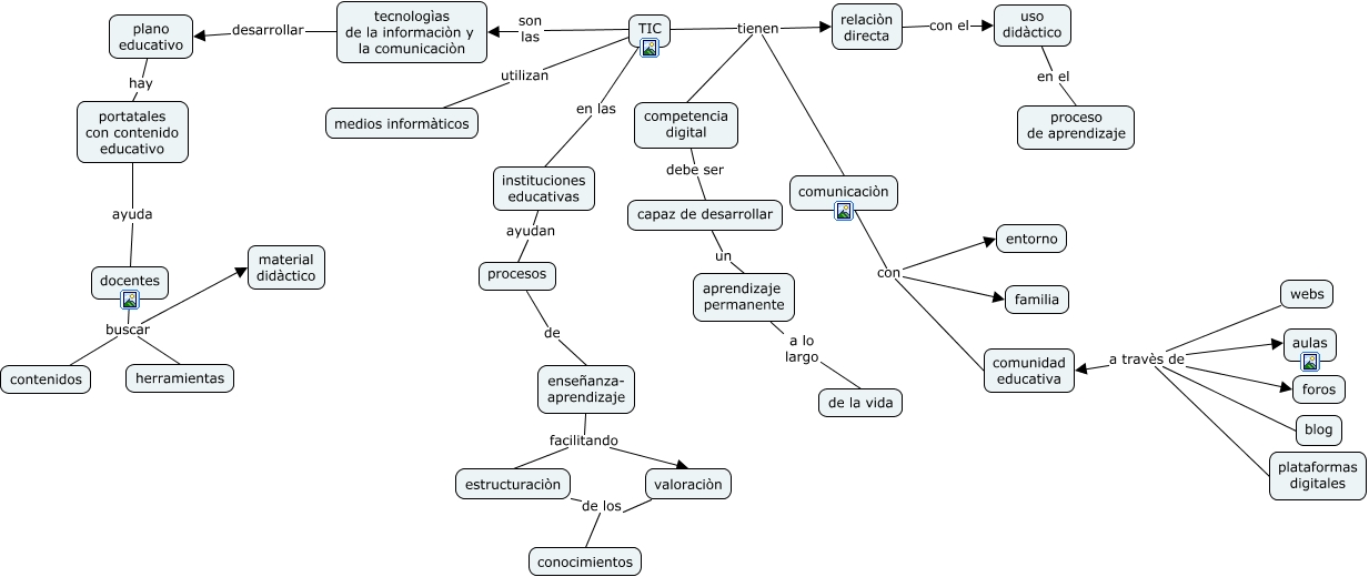 Este Cmap, tiene información relacionada con: que son las tic, webs a travès de plataformas digitales, TIC tienen relaciòn directa, competencia digital debe ser capaz de desarrollar, comunicaciòn con entorno, enseñanza- aprendizaje facilitando estructuraciòn, comunicaciòn con familia, webs a travès de foros, relaciòn directa con el uso didàctico, webs a travès de comunidad educativa, webs a travès de aulas, TIC utilizan medios informàticos, TIC tienen comunicaciòn, instituciones educativas ayudan procesos, estructuraciòn de los conocimientos, tecnologìas de la informaciòn y la comunicaciòn desarrollar plano educativo, aprendizaje permanente a lo largo de la vida, comunicaciòn con comunidad educativa, TIC son las tecnologìas de la informaciòn y la comunicaciòn, TIC tienen competencia digital, docentes buscar material didàctico