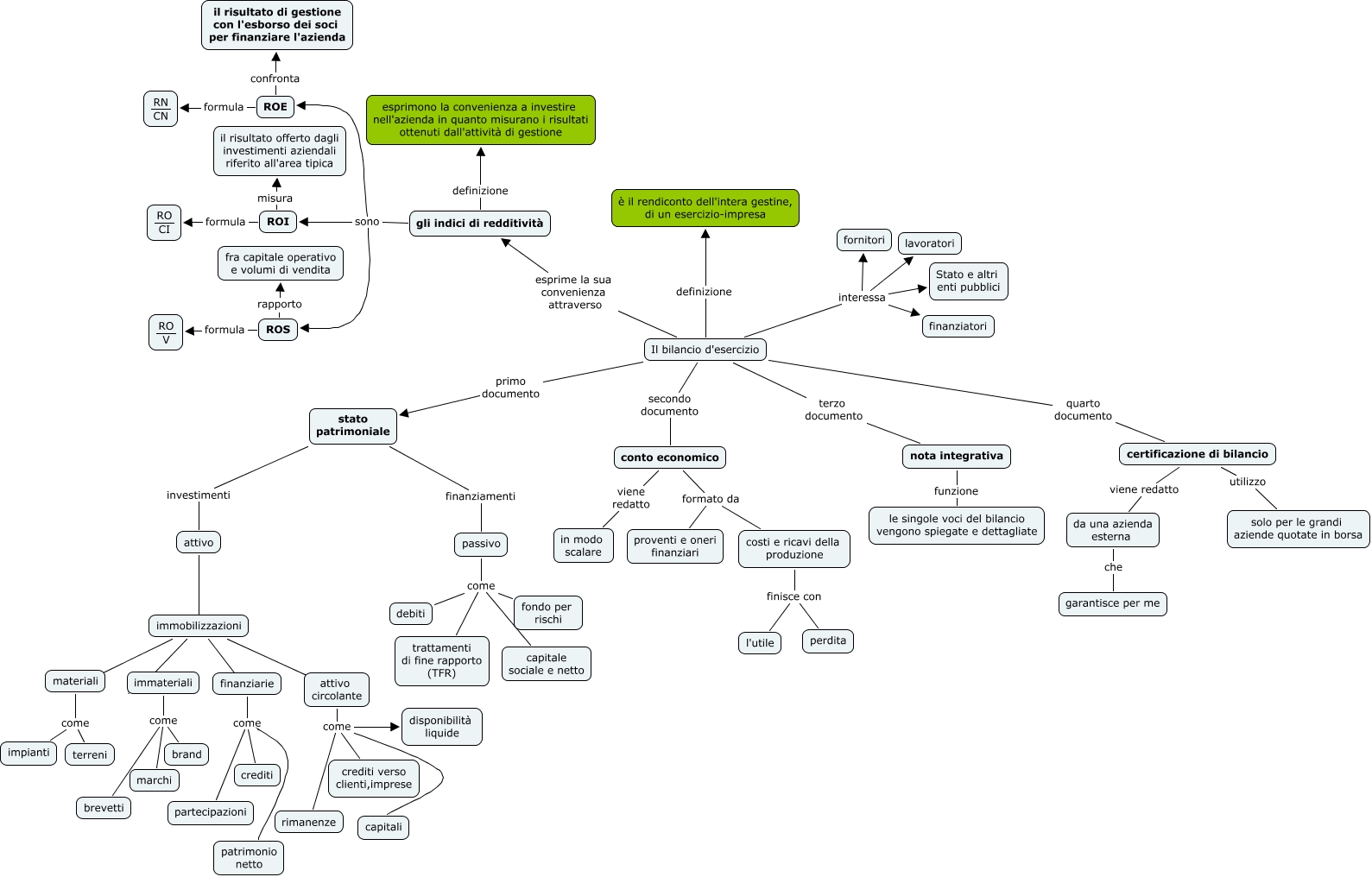 Questa Cmap, creata con IHMC CmapTools, contiene informazioni relative a: Bilancio d'esercizio, finanziarie come patrimonio netto, ROI formula <math xmlns="http://www.w3.org/1998/Math/MathML"> <mrow> <mfrac> <mtext> RO </mtext> <mtext> CI </mtext> </mfrac> </mrow> </math>, materiali come impianti, attivo circolante come crediti verso clienti,imprese, ROE confronta il risultato di gestione con l'esborso dei soci per finanziare l'azienda, Il bilancio d'esercizio interessa fornitori, gli indici di redditività sono ROE, Il bilancio d'esercizio terzo documento nota integrativa, Il bilancio d'esercizio definizione è il rendiconto dell'intera gestine, di un esercizio-impresa, conto economico formato da costi e ricavi della produzione, immateriali come brand, immobilizzazioni ???? immateriali, ROS rapporto fra capitale operativo e volumi di vendita, immobilizzazioni ???? finanziarie, passivo come trattamenti di fine rapporto (TFR), materiali come terreni, nota integrativa funzione le singole voci del bilancio vengono spiegate e dettagliate, passivo come fondo per rischi, immateriali come brevetti, ROS formula <math xmlns="http://www.w3.org/1998/Math/MathML"> <mrow> <mfrac> <mtext> RO </mtext> <mtext> V </mtext> </mfrac> </mrow> </math>