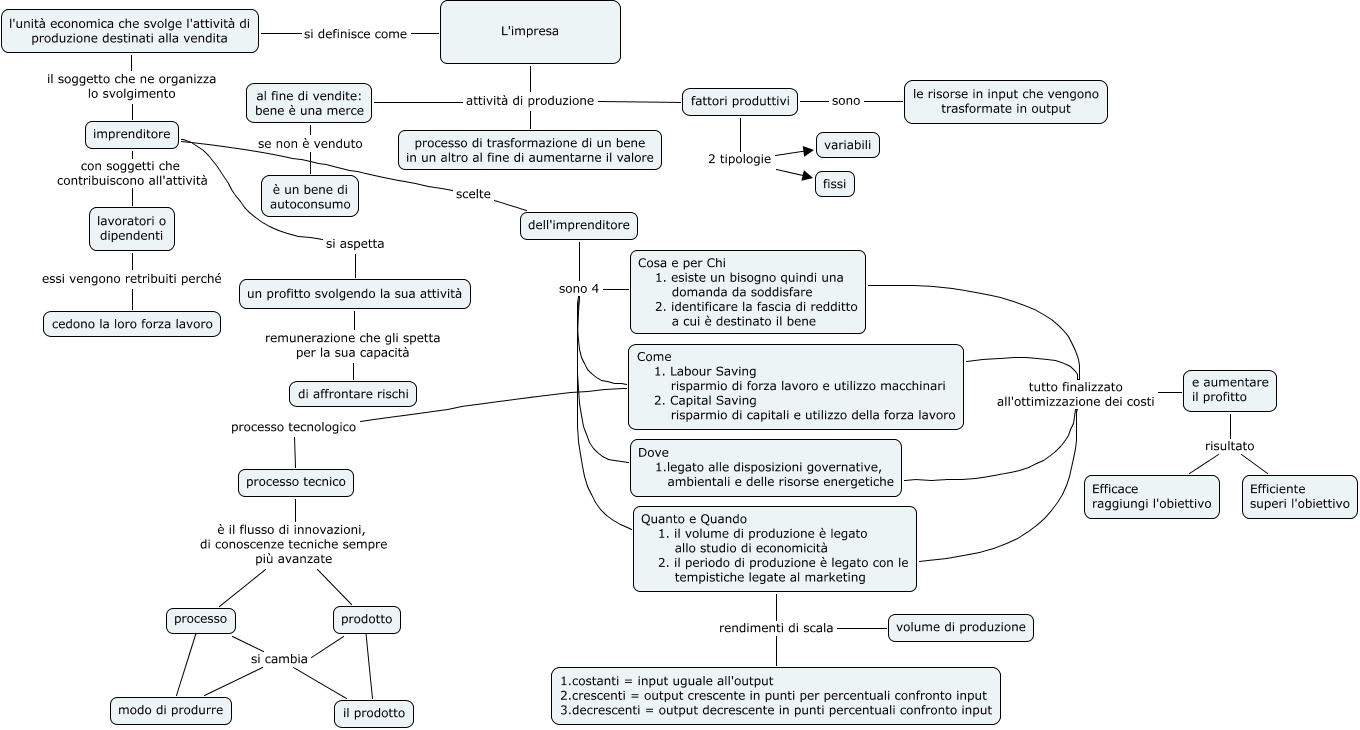 Questa Cmap, creata con IHMC CmapTools, contiene informazioni relative a: L'attività produtiva, scelte dell'imprenditore, prodotto ???? il prodotto, processo tecnico è il flusso di innovazioni, di conoscenze tecniche sempre più avanzate prodotto, fattori produttivi 2 tipologie fissi, Come 1. Labour Saving risparmio di forza lavoro e utilizzo macchinari 2. Capital Saving risparmio di capitali e utilizzo della forza lavoro tutto finalizzato all'ottimizzazione dei costi e aumentare il profitto, l'unità economica che svolge l'attività di produzione destinati alla vendita il soggetto che ne organizza lo svolgimento imprenditore, e aumentare il profitto risultato Efficiente superi l'obiettivo, lavoratori o dipendenti essi vengono retribuiti perché cedono la loro forza lavoro, prodotto si cambia il prodotto, fattori produttivi sono le risorse in input che vengono trasformate in output, L'impresa attività di produzione processo di trasformazione di un bene in un altro al fine di aumentarne il valore, dell'imprenditore sono 4 Come 1. Labour Saving risparmio di forza lavoro e utilizzo macchinari 2. Capital Saving risparmio di capitali e utilizzo della forza lavoro, imprenditore scelte dell'imprenditore, L'impresa attività di produzione fattori produttivi, Cosa e per Chi 1. esiste un bisogno quindi una domanda da soddisfare 2. identificare la fascia di redditto a cui è destinato il bene tutto finalizzato all'ottimizzazione dei costi e aumentare il profitto, Dove 1.legato alle disposizioni governative, ambientali e delle risorse energetiche tutto finalizzato all'ottimizzazione dei costi e aumentare il profitto, imprenditore si aspetta un profitto svolgendo la sua attività, Quanto e Quando 1. il volume di produzione è legato allo studio di economicità 2. il periodo di produzione è legato con le tempistiche legate al marketing rendimenti di scala 1.costanti = input uguale all'output 2.crescenti = output crescente in punti per percentuali confronto input 3.decrescenti = output decrescente in punti percentuali confronto input, Come 1. Labour Saving risparmio di forza lavoro e utilizzo macchinari 2. Capital Saving risparmio di capitali e utilizzo della forza lavoro processo tecnologico processo tecnico, dell'imprenditore sono 4 Cosa e per Chi 1. esiste un bisogno quindi una domanda da soddisfare 2. identificare la fascia di redditto a cui è destinato il bene, processo si cambia il prodotto