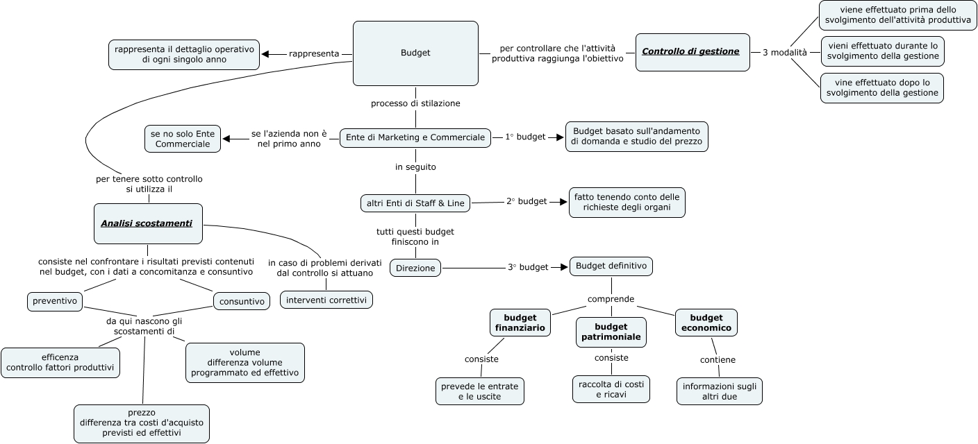 Questa Cmap, creata con IHMC CmapTools, contiene informazioni relative a: Budget, Ente di Marketing e Commerciale 1° budget Budget basato sull'andamento di domanda e studio del prezzo, consuntivo da qui nascono gli scostamenti di efficenza controllo fattori produttivi, altri Enti di Staff & Line 2° budget fatto tenendo conto delle richieste degli organi, Direzione 3° budget Budget definitivo, Analisi scostamenti in caso di problemi derivati dal controllo si attuano interventi correttivi, Budget definitivo comprende budget economico, Budget per controllare che l'attività produttiva raggiunga l'obiettivo Controllo di gestione, Budget definitivo comprende budget finanziario, Budget definitivo comprende budget patrimoniale, budget patrimoniale consiste raccolta di costi e ricavi, budget economico contiene informazioni sugli altri due, Controllo di gestione 3 modalità vine effettuato dopo lo svolgimento della gestione, budget finanziario consiste prevede le entrate e le uscite, Analisi scostamenti consiste nel confrontare i risultati previsti contenuti nel budget, con i dati a concomitanza e consuntivo consuntivo, Ente di Marketing e Commerciale in seguito altri Enti di Staff & Line, Analisi scostamenti consiste nel confrontare i risultati previsti contenuti nel budget, con i dati a concomitanza e consuntivo preventivo, Budget rappresenta rappresenta il dettaglio operativo di ogni singolo anno, consuntivo da qui nascono gli scostamenti di prezzo differenza tra costi d'acquisto previsti ed effettivi, Ente di Marketing e Commerciale se l'azienda non è nel primo anno se no solo Ente Commerciale, preventivo da qui nascono gli scostamenti di efficenza controllo fattori produttivi
