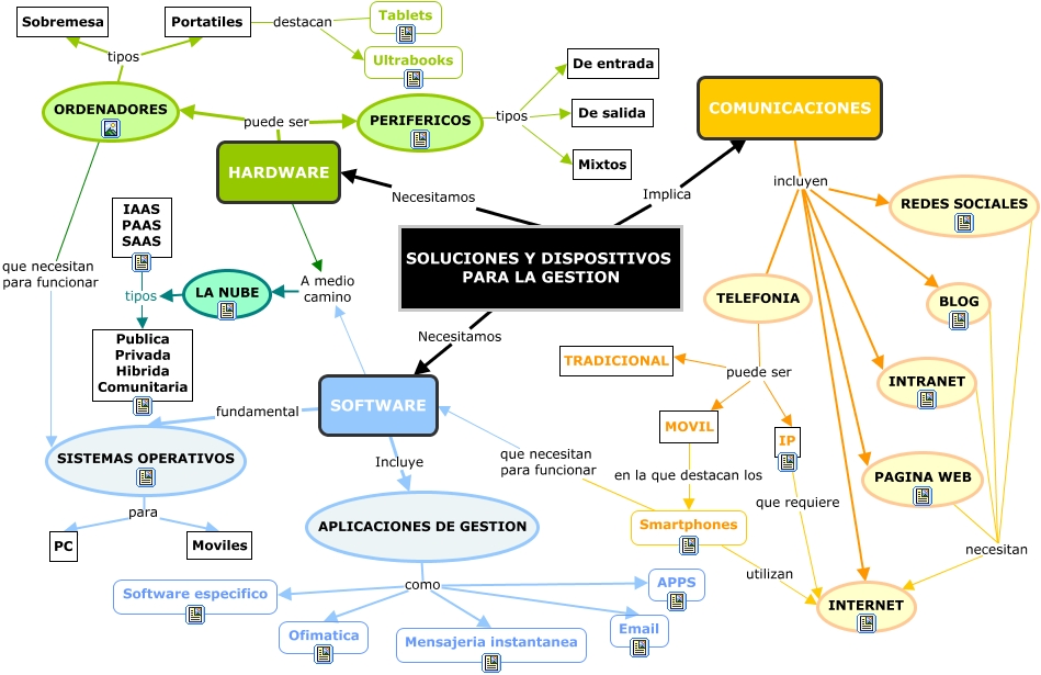 Este Cmap, tiene información relacionada con: SOLUCIONES Y DISPOSITIVOS, COMUNICACIONES incluyen TELEFONIA, COMUNICACIONES incluyen PAGINA WEB, SOLUCIONES Y DISPOSITIVOS PARA LA GESTION Necesitamos HARDWARE, SOLUCIONES Y DISPOSITIVOS PARA LA GESTION Necesitamos SOFTWARE, Portatiles destacan Tablets, Smartphones que necesitan para funcionar SOFTWARE, APLICACIONES DE GESTION como Mensajeria instantanea, HARDWARE puede ser ORDENADORES, ORDENADORES tipos Portatiles, APLICACIONES DE GESTION como Software especifico, SOLUCIONES Y DISPOSITIVOS PARA LA GESTION Implica COMUNICACIONES, PERIFERICOS tipos De entrada, COMUNICACIONES incluyen INTERNET, SISTEMAS OPERATIVOS para PC, IP que requiere INTERNET, SOFTWARE Incluye APLICACIONES DE GESTION, SISTEMAS OPERATIVOS para Moviles, PERIFERICOS tipos De salida, ORDENADORES tipos Sobremesa, APLICACIONES DE GESTION como Ofimatica