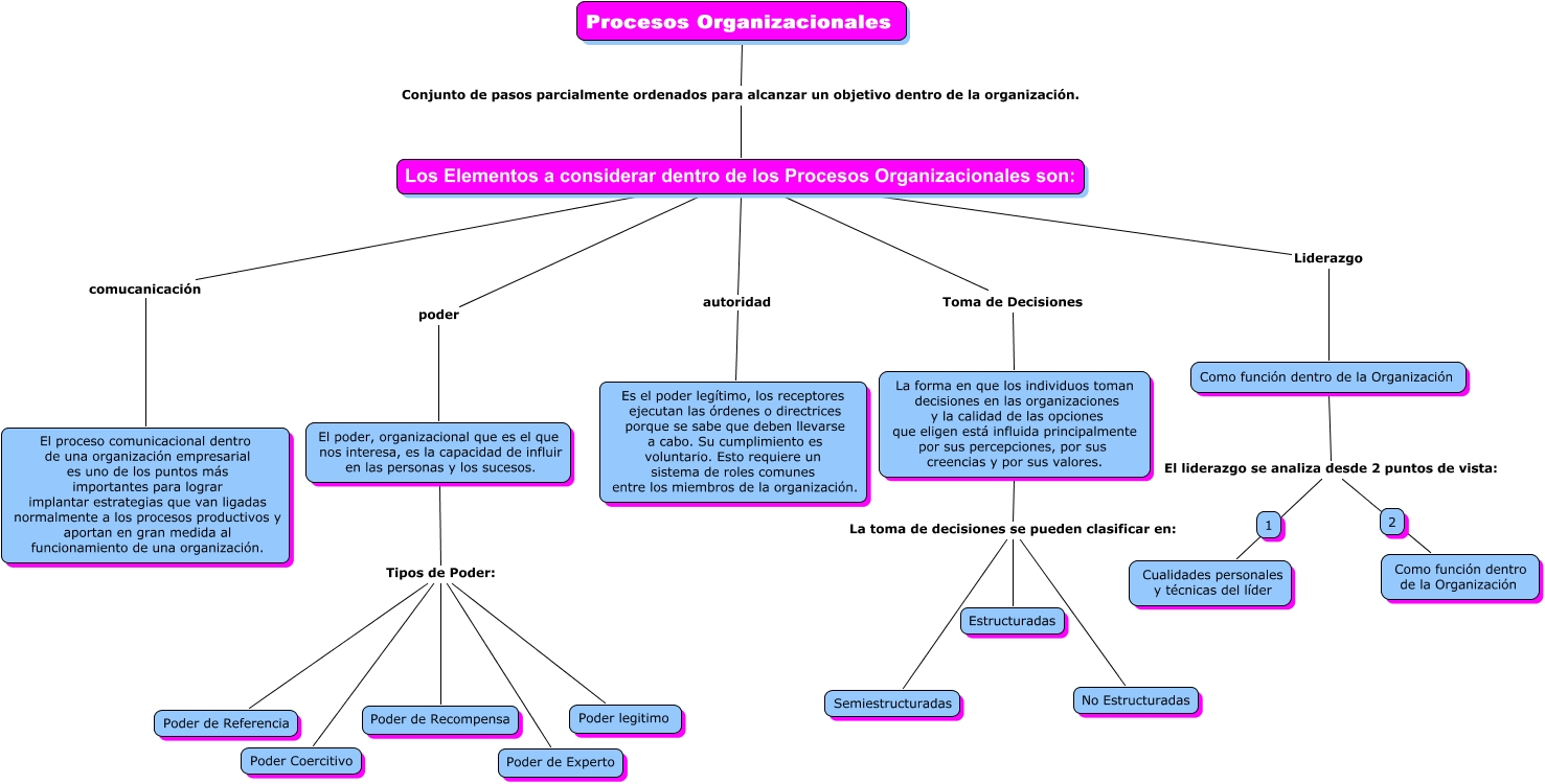 Este Cmap, tiene información relacionada con: mapaaaaa, Los Elementos a considerar dentro de los Procesos Organizacionales son: poder El poder, organizacional que es el que nos interesa, es la capacidad de influir en las personas y los sucesos., Procesos Organizacionales Conjunto de pasos parcialmente ordenados para alcanzar un objetivo dentro de la organización. Los Elementos a considerar dentro de los Procesos Organizacionales son:, Los Elementos a considerar dentro de los Procesos Organizacionales son: autoridad Es el poder legítimo, los receptores ejecutan las órdenes o directrices porque se sabe que deben llevarse a cabo. Su cumplimiento es voluntario. Esto requiere un sistema de roles comunes entre los miembros de la organización., Como función dentro de la Organización El liderazgo se analiza desde 2 puntos de vista: Como función dentro de la Organización, La forma en que los individuos toman decisiones en las organizaciones y la calidad de las opciones que eligen está influida principalmente por sus percepciones, por sus creencias y por sus valores. La toma de decisiones se pueden clasificar en: No Estructuradas, El poder, organizacional que es el que nos interesa, es la capacidad de influir en las personas y los sucesos. Tipos de Poder: Poder legitimo, El poder, organizacional que es el que nos interesa, es la capacidad de influir en las personas y los sucesos. Tipos de Poder: Poder de Recompensa, La forma en que los individuos toman decisiones en las organizaciones y la calidad de las opciones que eligen está influida principalmente por sus percepciones, por sus creencias y por sus valores. La toma de decisiones se pueden clasificar en: Semiestructuradas, El poder, organizacional que es el que nos interesa, es la capacidad de influir en las personas y los sucesos. Tipos de Poder: Poder de Experto, Los Elementos a considerar dentro de los Procesos Organizacionales son: Liderazgo Como función dentro de la Organización, El poder, organizacional que es el que nos interesa, es la capacidad de influir en las personas y los sucesos. Tipos de Poder: Poder de Referencia, Los Elementos a considerar dentro de los Procesos Organizacionales son: Toma de Decisiones La forma en que los individuos toman decisiones en las organizaciones y la calidad de las opciones que eligen está influida principalmente por sus percepciones, por sus creencias y por sus valores., Como función dentro de la Organización El liderazgo se analiza desde 2 puntos de vista: Cualidades personales y técnicas del líder, El poder, organizacional que es el que nos interesa, es la capacidad de influir en las personas y los sucesos. Tipos de Poder: Poder Coercitivo, Los Elementos a considerar dentro de los Procesos Organizacionales son: comucanicación El proceso comunicacional dentro de una organización empresarial es uno de los puntos más importantes para lograr implantar estrategias que van ligadas normalmente a los procesos productivos y aportan en gran medida al funcionamiento de una organización., La forma en que los individuos toman decisiones en las organizaciones y la calidad de las opciones que eligen está influida principalmente por sus percepciones, por sus creencias y por sus valores. La toma de decisiones se pueden clasificar en: Estructuradas