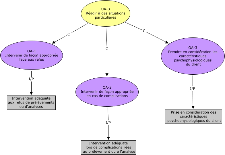 Cette carte de concepts créée avec IHMC CmapTools traite de: UA-3, OA-3 Prendre en considération les caractéristiques psychophysiologiques du client I/P Prise en considération des caractéristiques psychophysiologiques du client, OA-1 Intervenir de façon appropriée face aux refus I/P Intervention adéquate aux refus de prélèvements ou d'analyses, OA-2 Intervenir de façon appropriée en cas de complications I/P Intervention adéquate lors de complications liées au prélèvement ou à l'analyse, UA-3 Réagir à des situations particulières C OA-1 Intervenir de façon appropriée face aux refus, UA-3 Réagir à des situations particulières C OA-3 Prendre en considération les caractéristiques psychophysiologiques du client, UA-3 Réagir à des situations particulières C OA-2 Intervenir de façon appropriée en cas de complications
