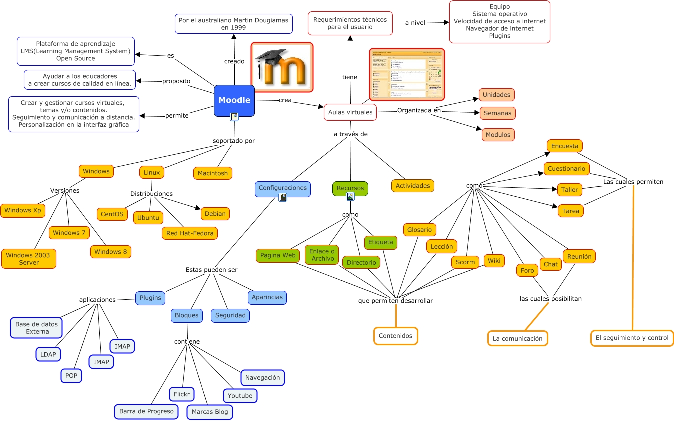 Este Cmap, tiene información relacionada con: MII-Mapa colaborativo-Grupo14, Configuraciones Estas pueden ser Bloques, Plugins aplicaciones IMAP, Aulas virtuales Organizada en Modulos, Linux Distribuciones Red Hat-Fedora, Moodle creado Por el australiano Martin Dougiamas en 1999, Windows Versiones Windows 8, Windows Versiones Windows 7, Bloques contiene Navegación, Actividades como Reunión, Actividades como Scorm, Recursos como Pagina Web, Requerimientos técnicos para el usuario a nivel Equipo Sistema operativo Velocidad de acceso a internet Navegador de internet Plugins, Aulas virtuales ., Aulas virtuales tiene Requerimientos técnicos para el usuario, Configuraciones Estas pueden ser Seguridad, Moodle soportado por Macintosh, Linux Distribuciones Ubuntu, Aulas virtuales a través de Actividades, Encuesta Las cuales permiten El seguimiento y control, Actividades como Glosario