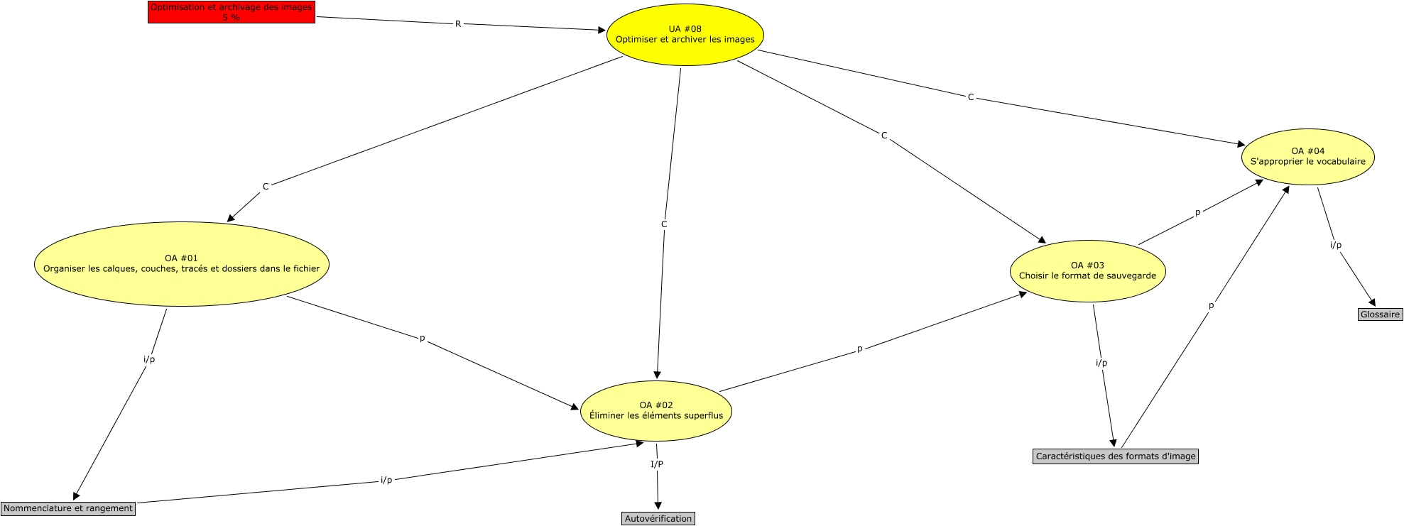 Cette carte de concepts créée avec IHMC CmapTools traite de: UA_08, UA #08 Optimiser et archiver les images C OA #04 S'approprier le vocabulaire, Optimisation et archivage des images 5 % R UA #08 Optimiser et archiver les images, UA #08 Optimiser et archiver les images C OA #03 Choisir le format de sauvegarde, UA #08 Optimiser et archiver les images C OA #01 Organiser les calques, couches, tracés et dossiers dans le fichier, Nommenclature et rangement i/p OA #02 Éliminer les éléments superflus, UA #08 Optimiser et archiver les images C OA #02 Éliminer les éléments superflus, OA #02 Éliminer les éléments superflus I/P Autovérification, OA #01 Organiser les calques, couches, tracés et dossiers dans le fichier i/p Nommenclature et rangement, OA #04 S'approprier le vocabulaire i/p Glossaire, OA #03 Choisir le format de sauvegarde i/p Caractéristiques des formats d'image, OA #03 Choisir le format de sauvegarde p OA #04 S'approprier le vocabulaire, Caractéristiques des formats d'image p OA #04 S'approprier le vocabulaire, OA #02 Éliminer les éléments superflus p OA #03 Choisir le format de sauvegarde, OA #01 Organiser les calques, couches, tracés et dossiers dans le fichier p OA #02 Éliminer les éléments superflus