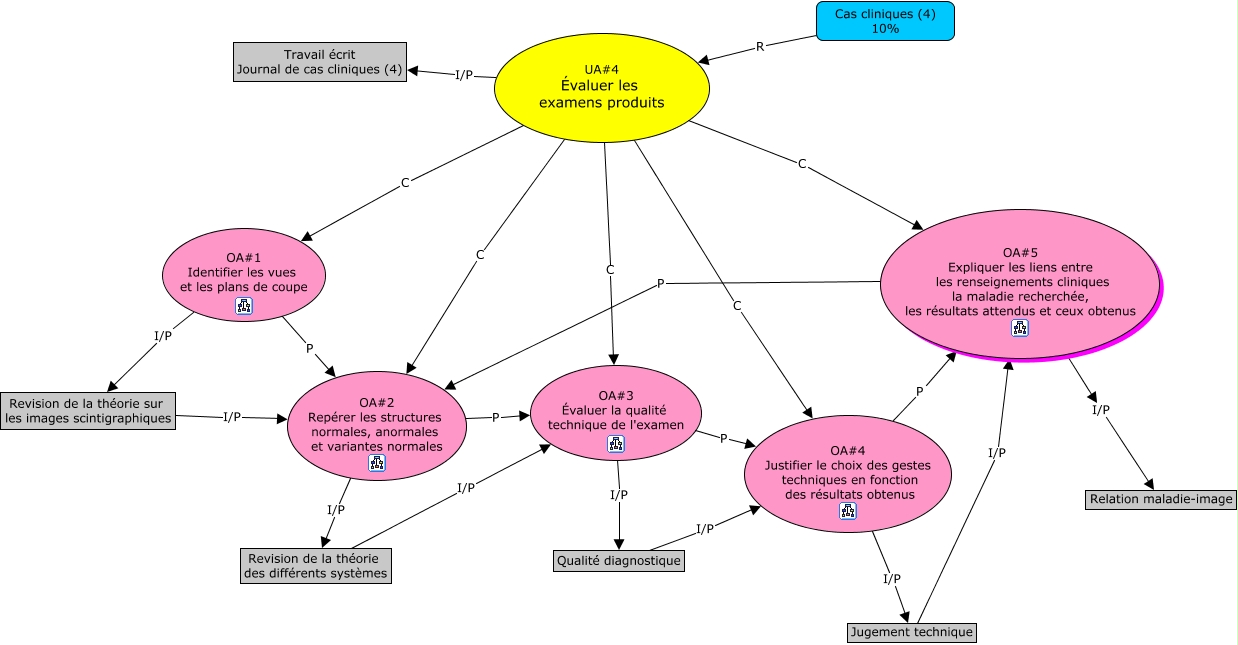 Cette carte de concepts créée avec IHMC CmapTools traite de: UA4, OA#2 Repérer les structures normales, anormales et variantes normales P OA#3 Évaluer la qualité technique de l'examen, OA#4 Justifier le choix des gestes techniques en fonction des résultats obtenus I/P Jugement technique, UA#4 Évaluer les examens produits C OA#4 Justifier le choix des gestes techniques en fonction des résultats obtenus, OA#4 Justifier le choix des gestes techniques en fonction des résultats obtenus P OA#5 Expliquer les liens entre les renseignements cliniques la maladie recherchée, les résultats attendus et ceux obtenus, UA#4 Évaluer les examens produits C OA#1 Identifier les vues et les plans de coupe, Jugement technique I/P OA#5 Expliquer les liens entre les renseignements cliniques la maladie recherchée, les résultats attendus et ceux obtenus, OA#2 Repérer les structures normales, anormales et variantes normales I/P Revision de la théorie des différents systèmes, OA#3 Évaluer la qualité technique de l'examen I/P Qualité diagnostique, OA#1 Identifier les vues et les plans de coupe I/P Revision de la théorie sur les images scintigraphiques, Revision de la théorie sur les images scintigraphiques I/P OA#2 Repérer les structures normales, anormales et variantes normales, UA#4 Évaluer les examens produits C OA#3 Évaluer la qualité technique de l'examen, OA#3 Évaluer la qualité technique de l'examen P OA#4 Justifier le choix des gestes techniques en fonction des résultats obtenus, OA#5 Expliquer les liens entre les renseignements cliniques la maladie recherchée, les résultats attendus et ceux obtenus I/P Relation maladie-image, UA#4 Évaluer les examens produits C OA#5 Expliquer les liens entre les renseignements cliniques la maladie recherchée, les résultats attendus et ceux obtenus, UA#4 Évaluer les examens produits I/P Travail écrit Journal de cas cliniques (4), Cas cliniques (4) 10% R UA#4 Évaluer les examens produits, Revision de la théorie des différents systèmes I/P OA#3 Évaluer la qualité technique de l'examen, OA#5 Expliquer les liens entre les renseignements cliniques la maladie recherchée, les résultats attendus et ceux obtenus P OA#2 Repérer les structures normales, anormales et variantes normales, OA#1 Identifier les vues et les plans de coupe P OA#2 Repérer les structures normales, anormales et variantes normales, UA#4 Évaluer les examens produits C OA#2 Repérer les structures normales, anormales et variantes normales